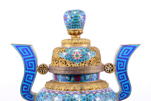 An exquisite cloisonne lotus pattern lion ear stove with lid
