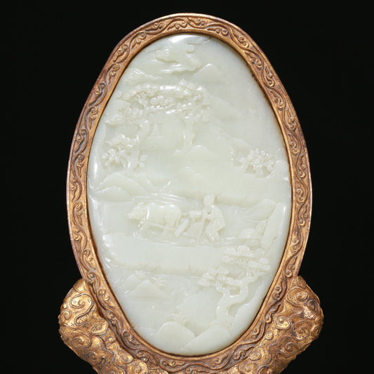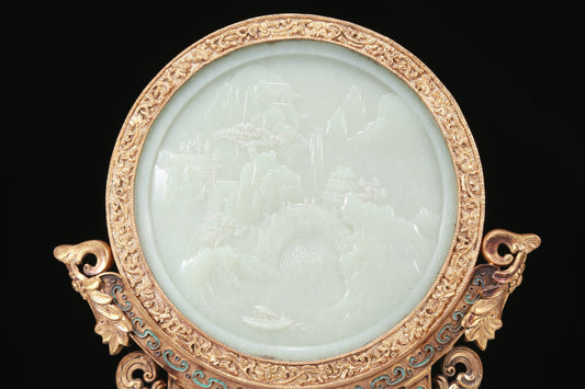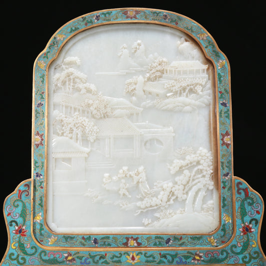 An Exquisite Imperial Cloisonne White Jade-Inlaid 'Landscape& Figure' Table Screen With Imperial Poem Inscriptions From Qianlong Period