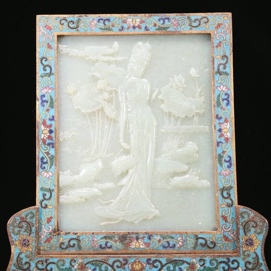 A Fabulous Cloisonne White Jade-Inlaid 'Landscape& Figure' Table Screen