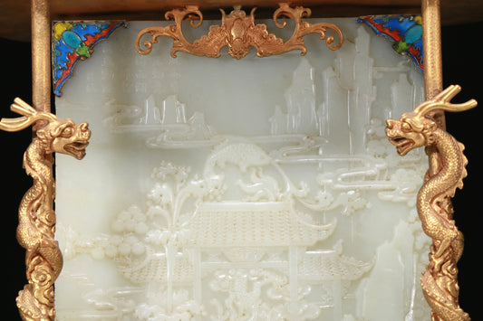A Fabulous Gilt-Bronze White Jade-Inlaid 'Dragon& Ocean' Table Screen