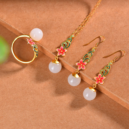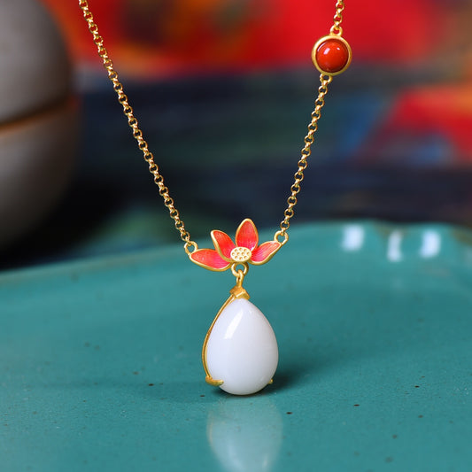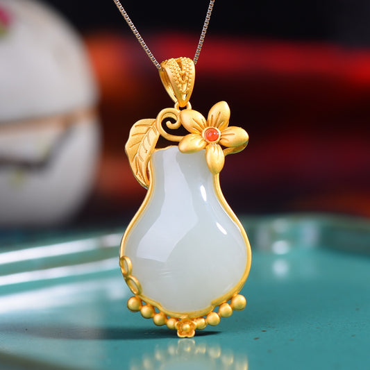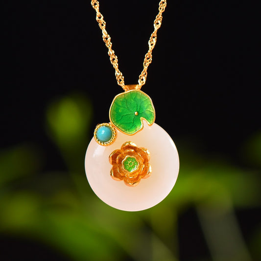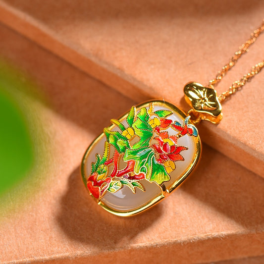 Silver gilt inlaid Hetian jade enamel flower blooming wealth pendant