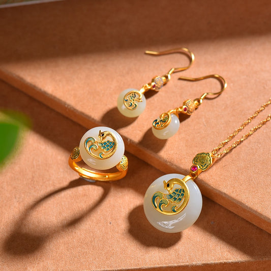 Silver gilt inlaid Hetian jade phoenix dance nine days brooch pendant dual use