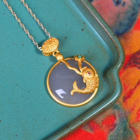 Silver gilt inlaid Hetian jade lotus gilt silver pendant