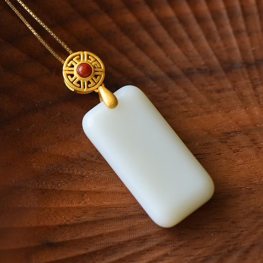Gilt silver inlaid Hetian jade peace plate with southern red pendant