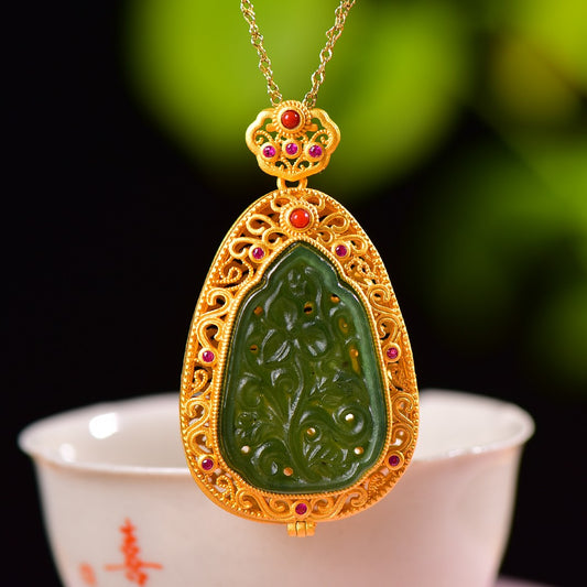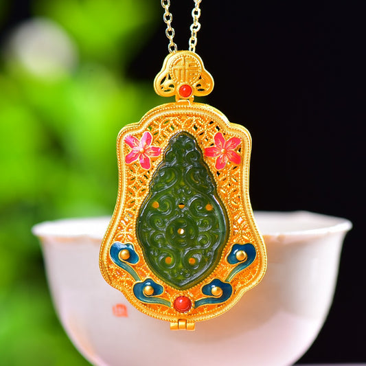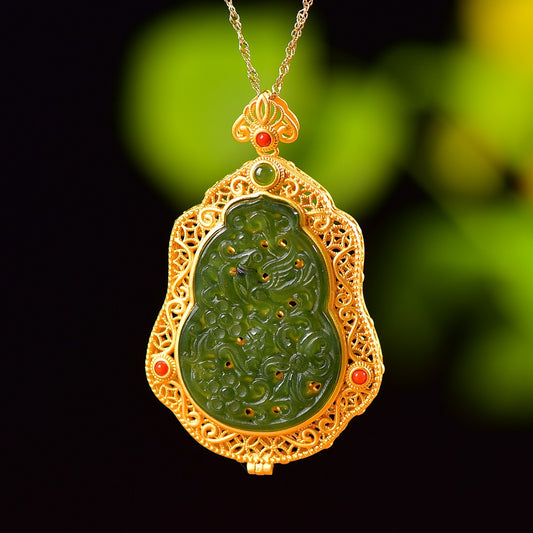 Gilt silver inlaid Hetian jasper hollow sachet pendant