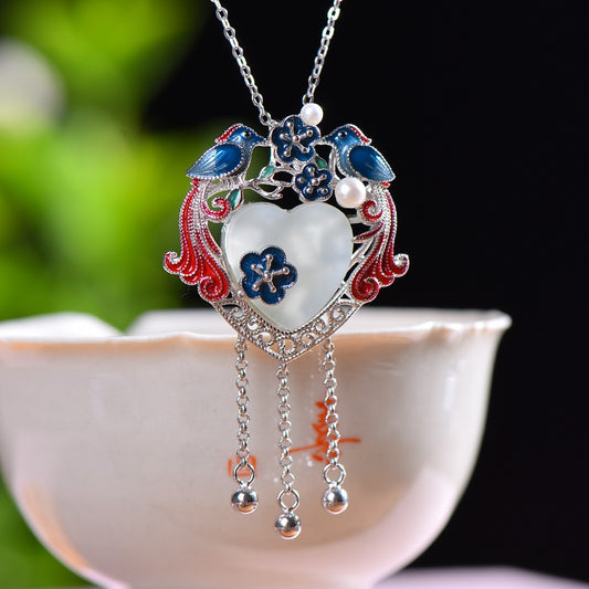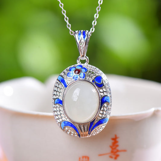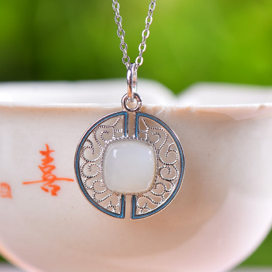 Silver inlaid Hetian jade enamel Ping An brand pendant