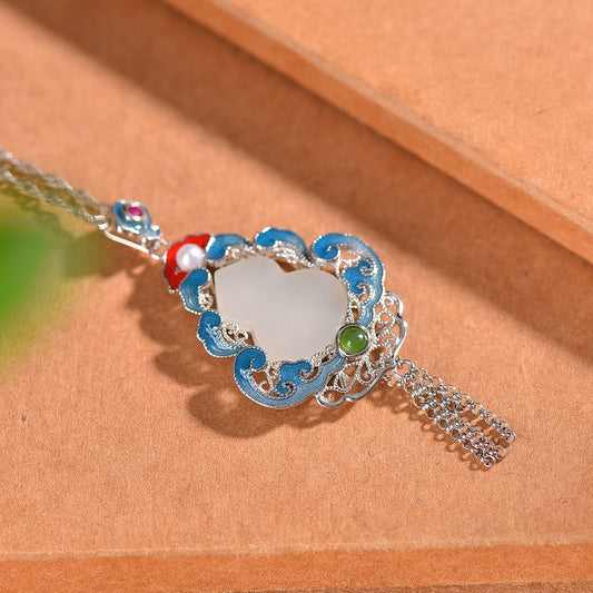 Silver inlaid Hetian jade enamel Ruyi lock pendant