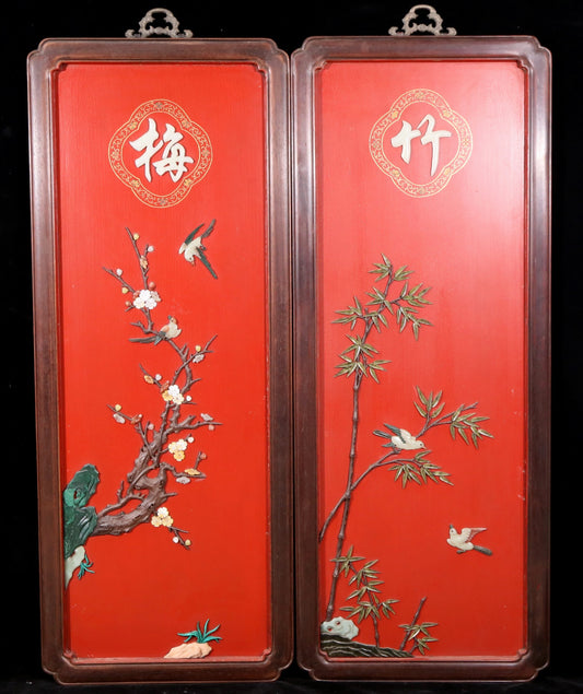 A set of exquisite zitanwood painted four-bar hanging screens inlaid with gems and flowers and birds.