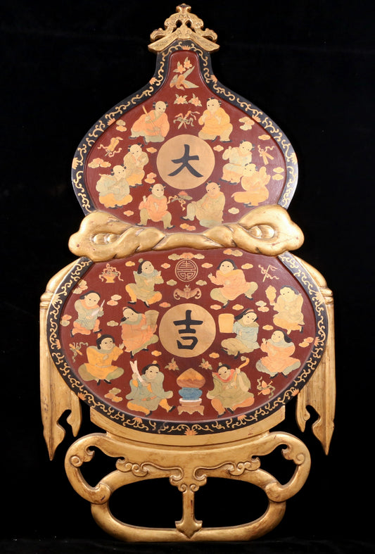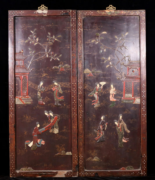 A pair of exquisite zitanwood painted figures with festive patterns and gourd hanging screens