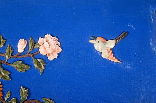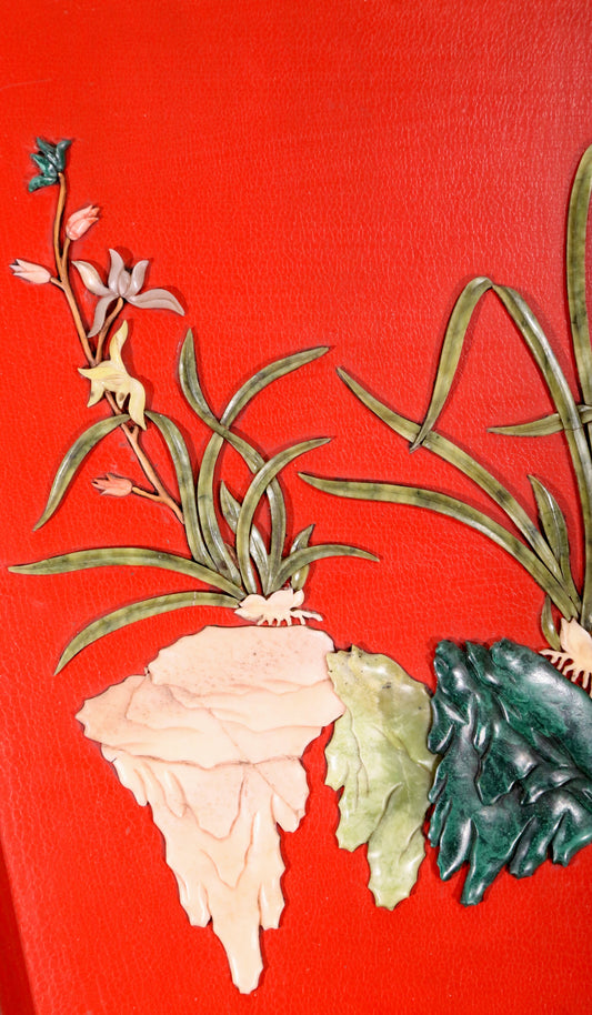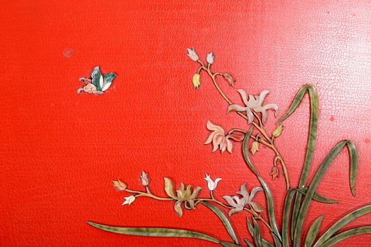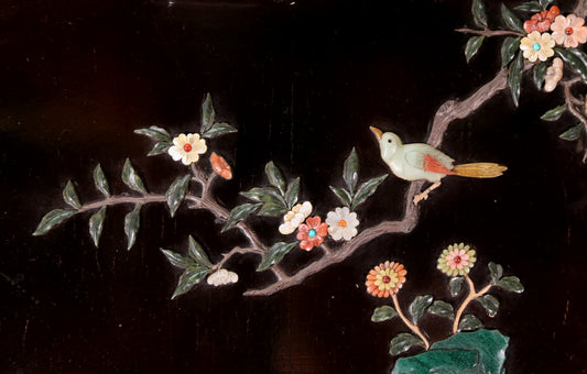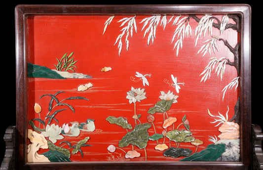 An exquisite lacquered huanghuali wood hanging screen with flower and bird patterns inlaid with gemstones