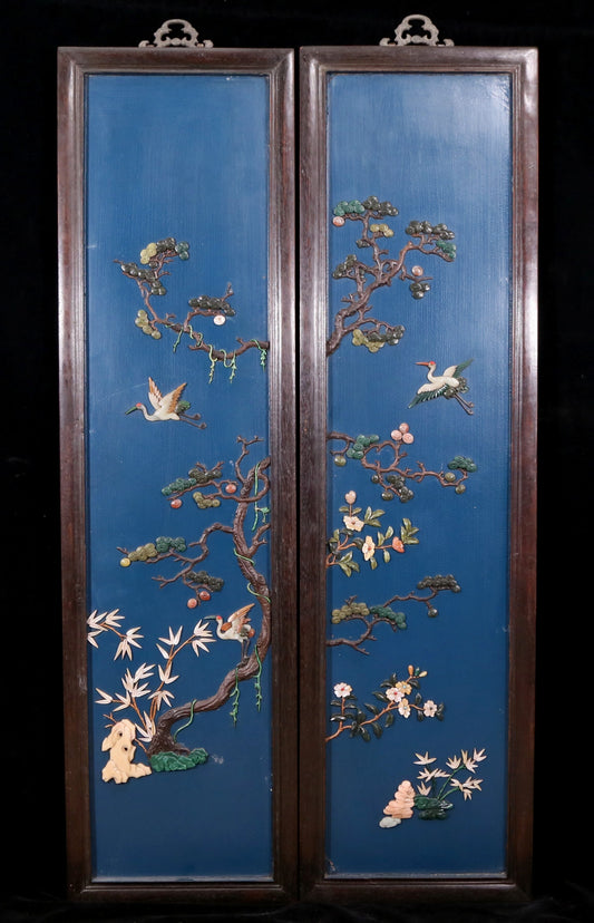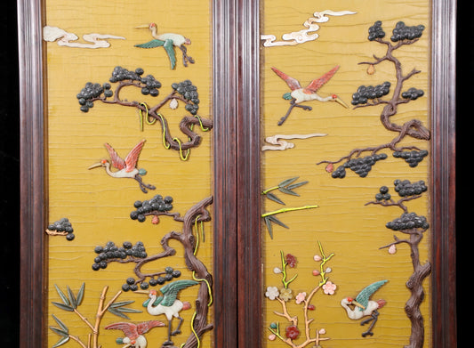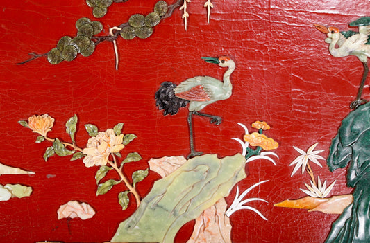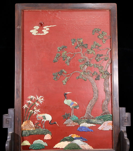 An exquisite zitanwood painted lacquered hanging screen with a pine and crane pattern inlaid with gemstones