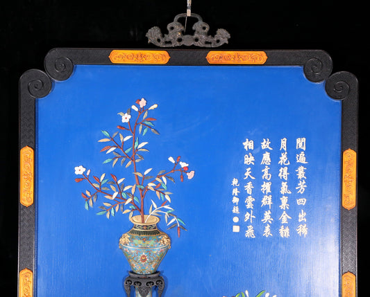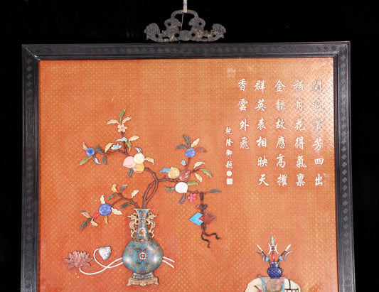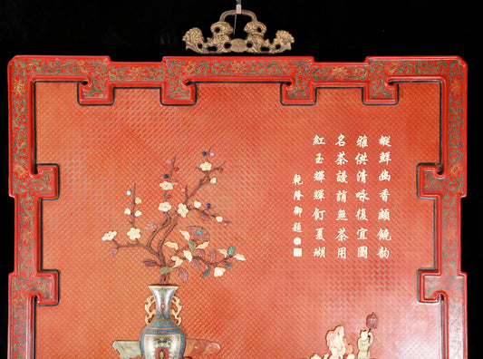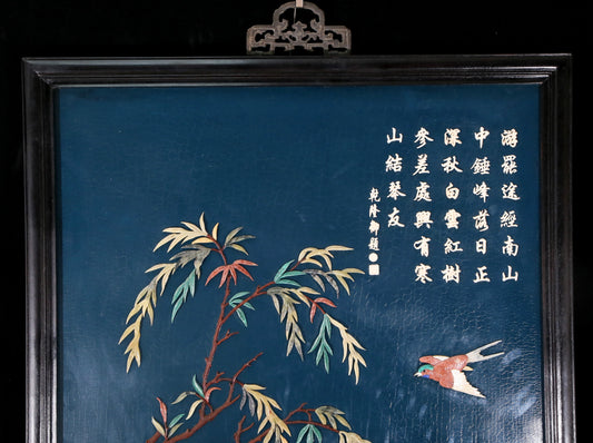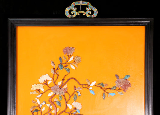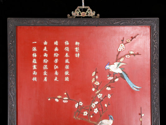 An exquisite zitanwood lacquered hanging screen with flower and bird patterns inlaid with gemstones