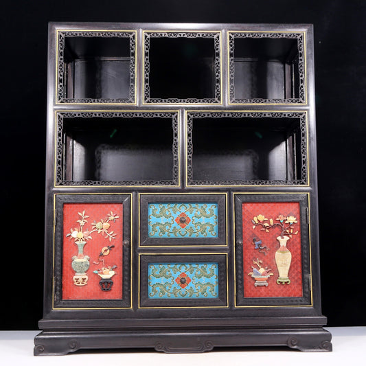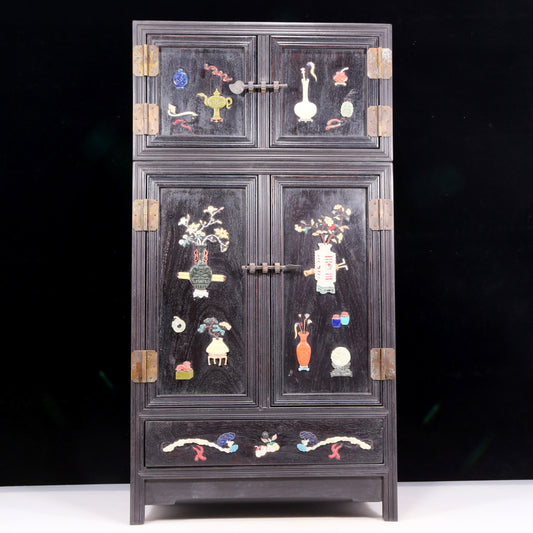 A pair of exquisite zitanwood cabinets with gold-filled lacquer and inlaid gemstones, treasures, patterns, and floral patterns.
