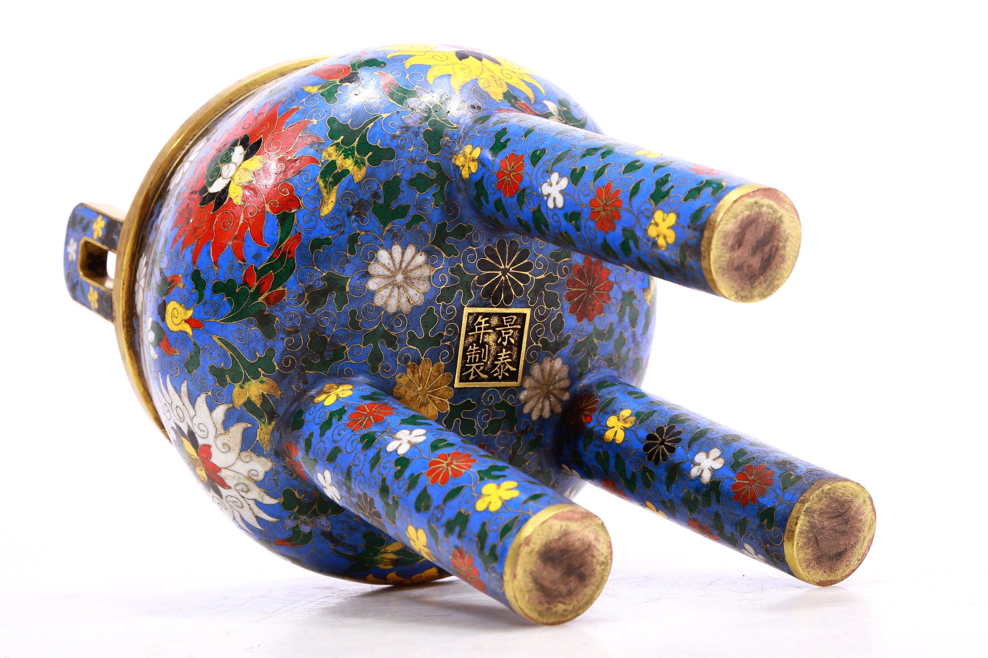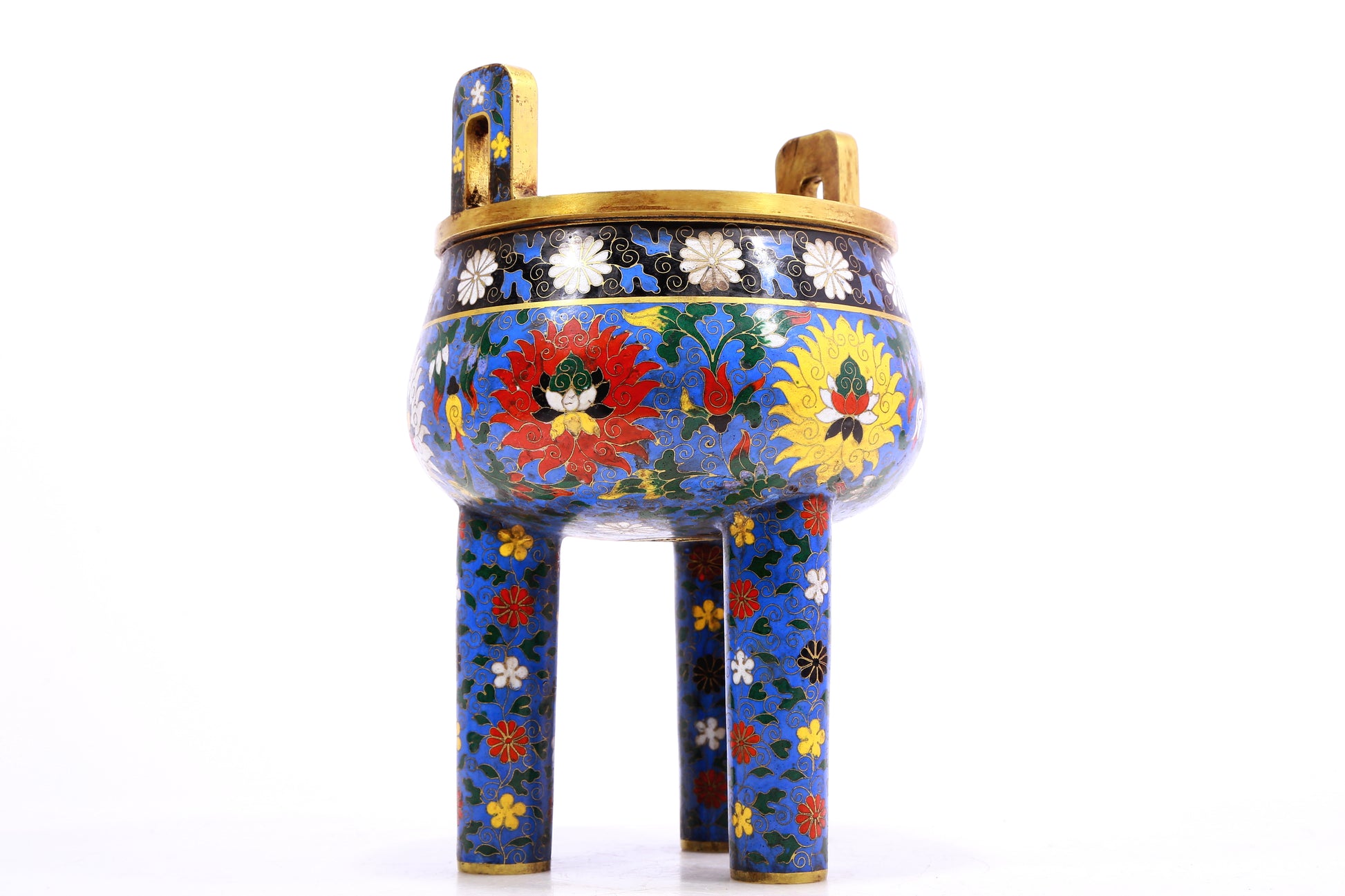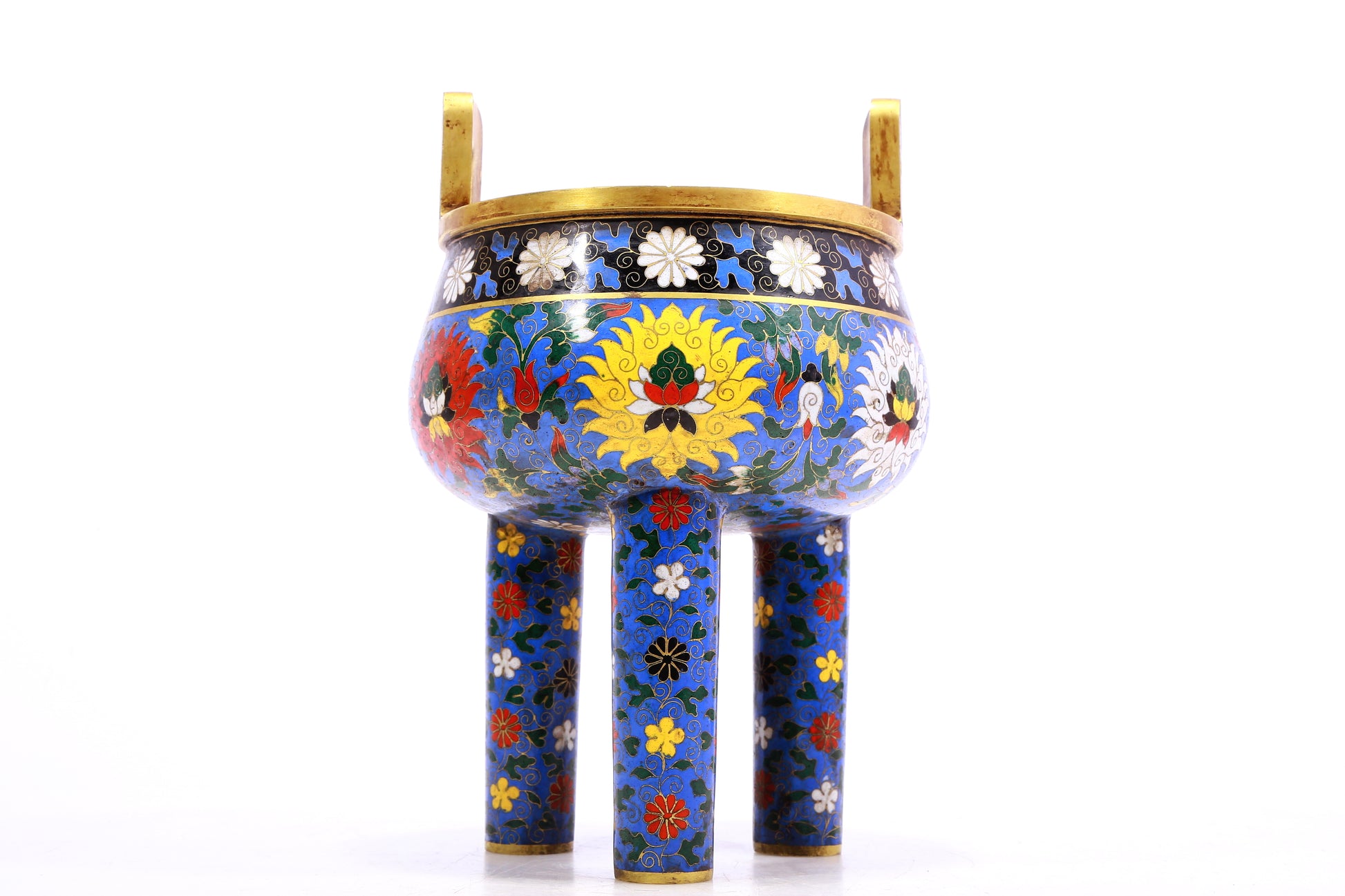 A Superb Cloisonne 'Scrolling Lotus' Tripod Censer. Supported on three tall, columnar feet, body enameled with polychrome floral scrolls, all reserved on a blue ground. Chinese Ming Dynasty. Jingtai Four-Character Mark. Size:17.5cmx28.5cm          明代  景泰年制四字款 景泰蓝缠枝莲纹双耳三足炉
