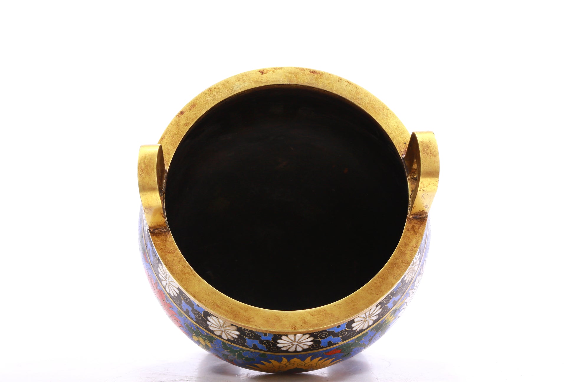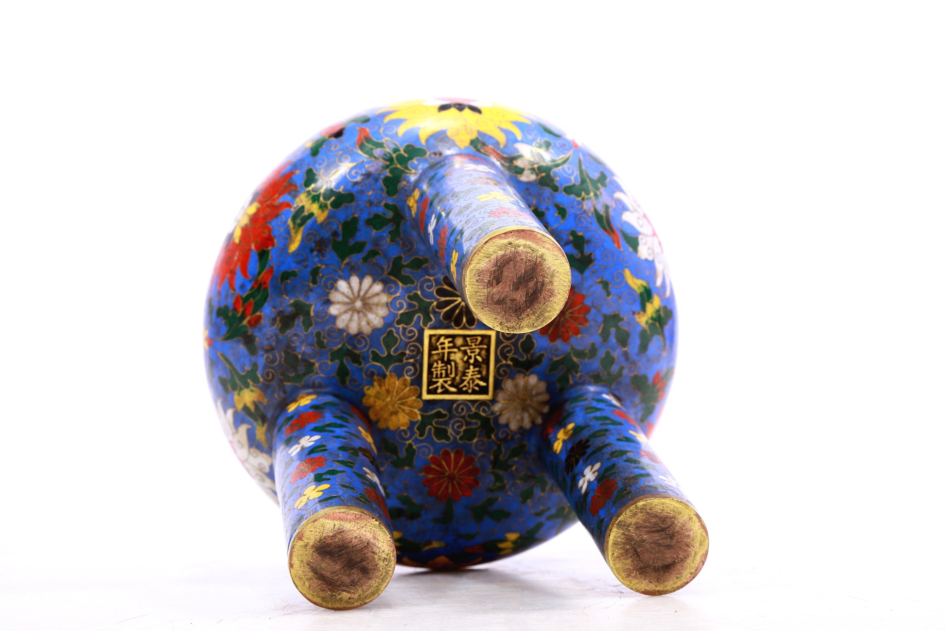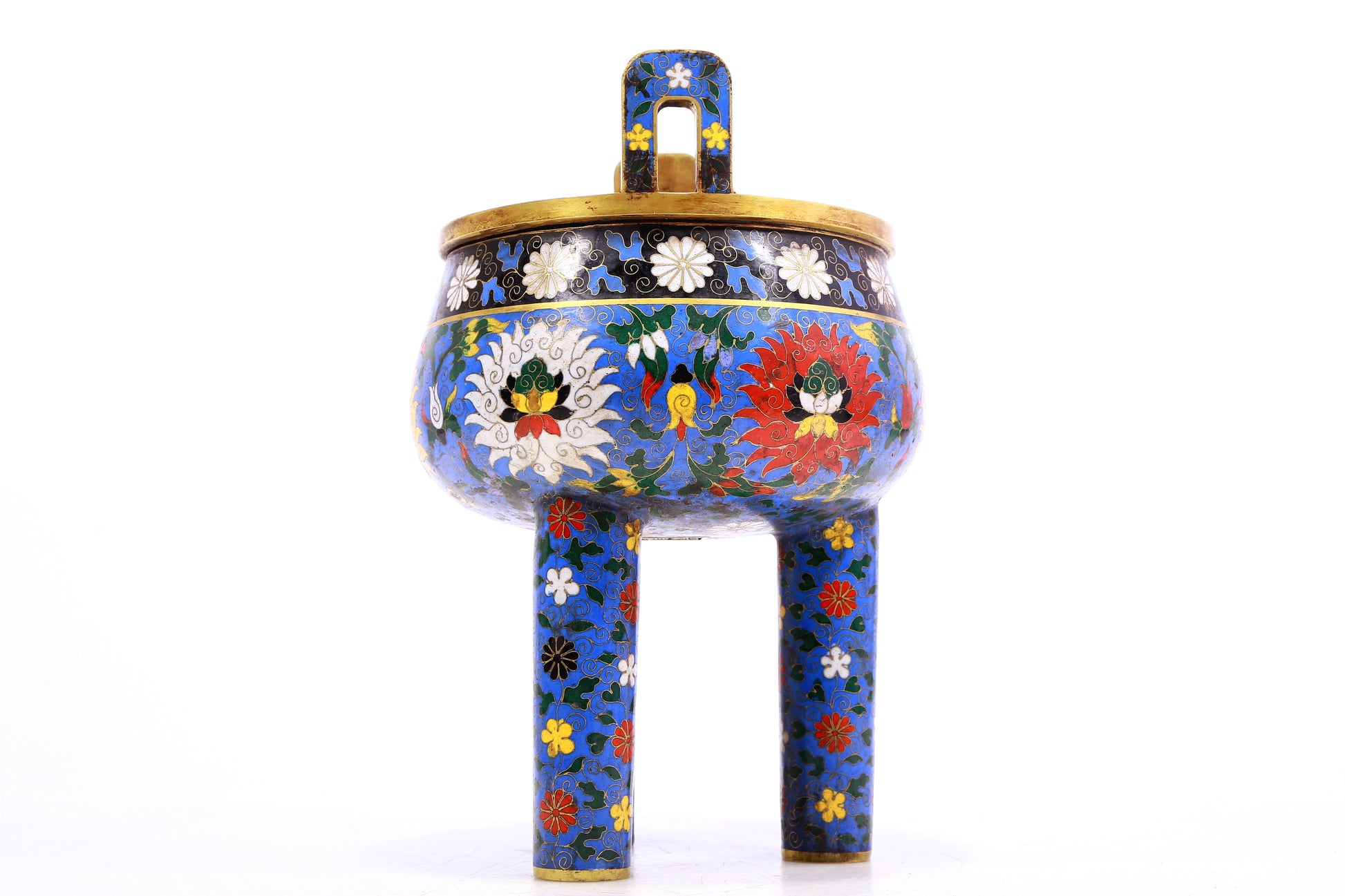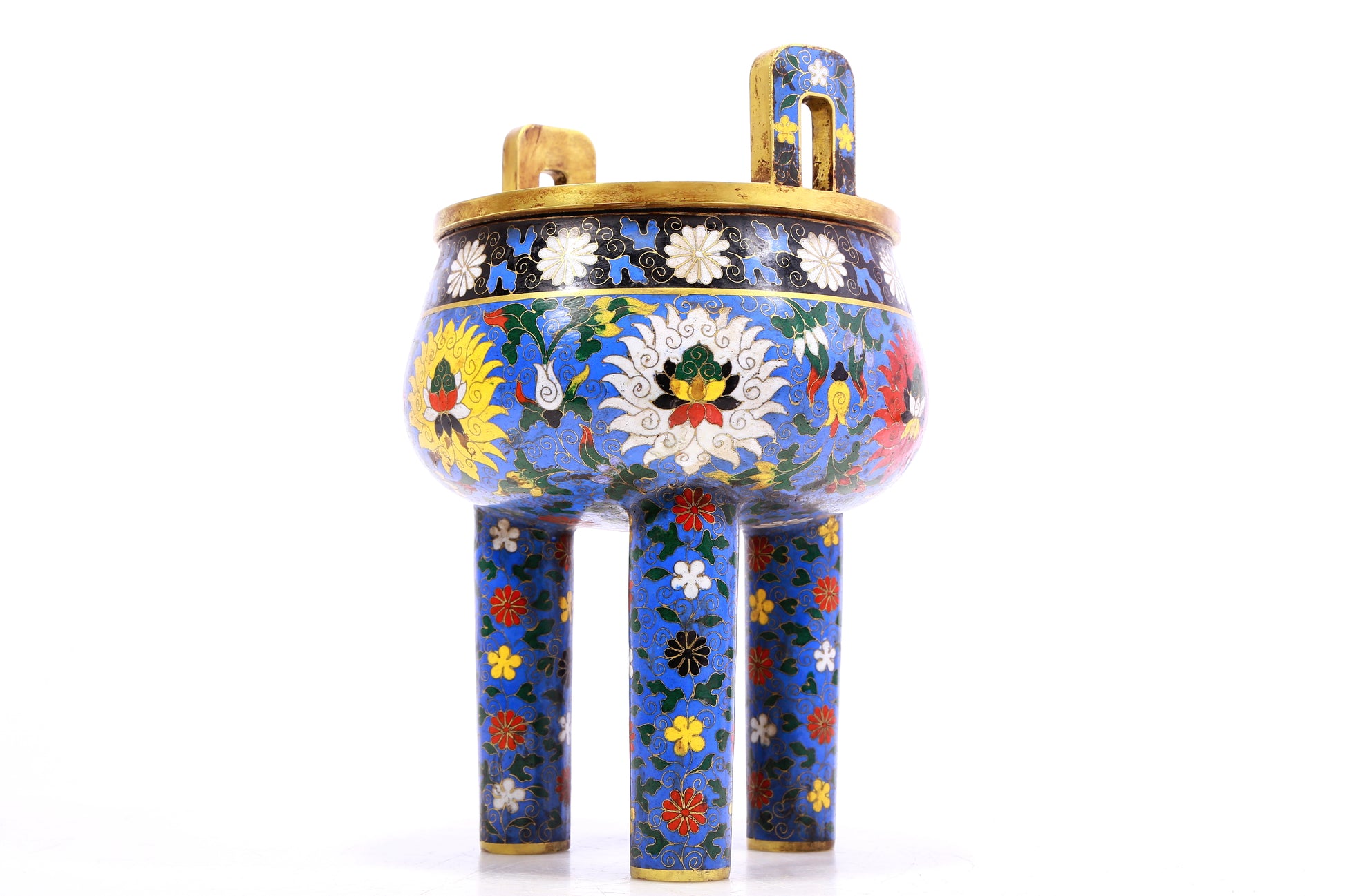 A Superb Cloisonne 'Scrolling Lotus' Tripod Censer. Supported on three tall, columnar feet, body enameled with polychrome floral scrolls, all reserved on a blue ground. Chinese Ming Dynasty. Jingtai Four-Character Mark. Size:17.5cmx28.5cm          明代  景泰年制四字款 景泰蓝缠枝莲纹双耳三足炉