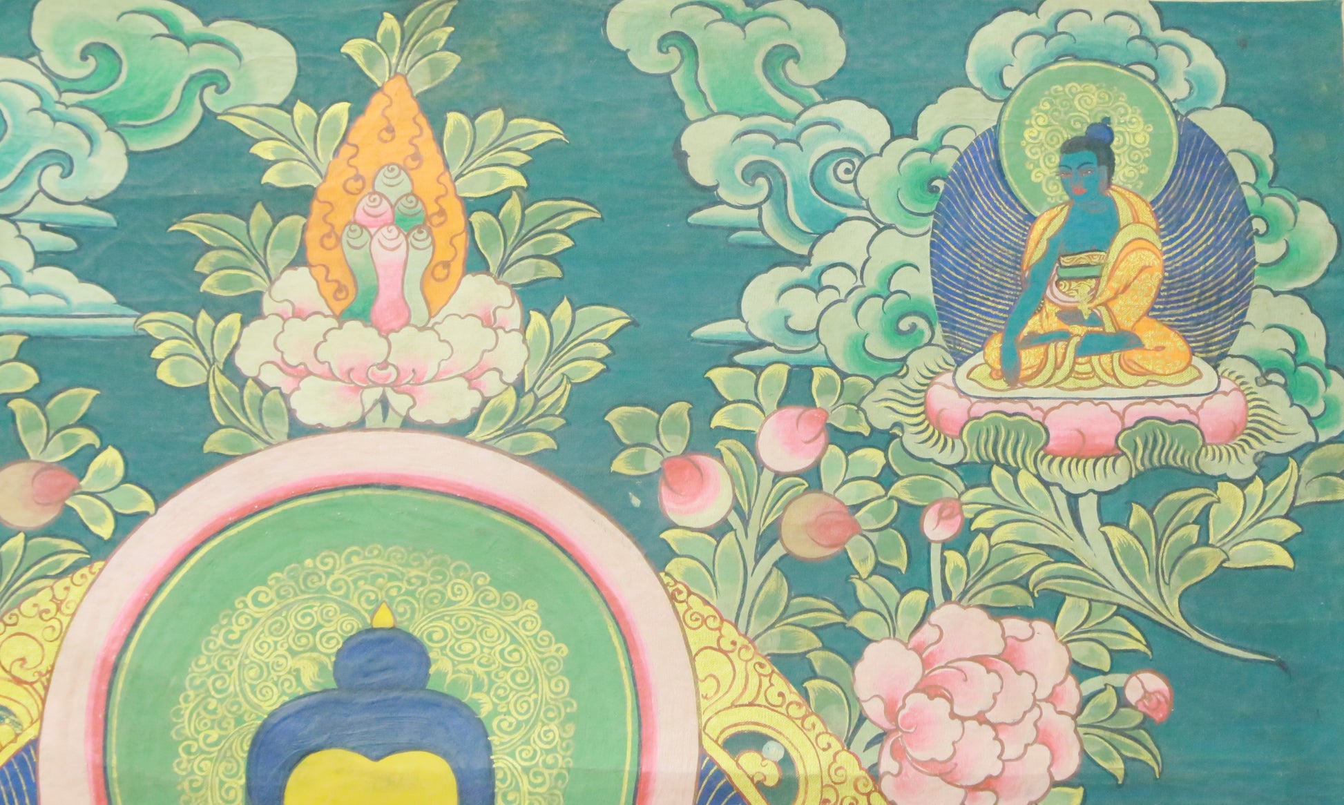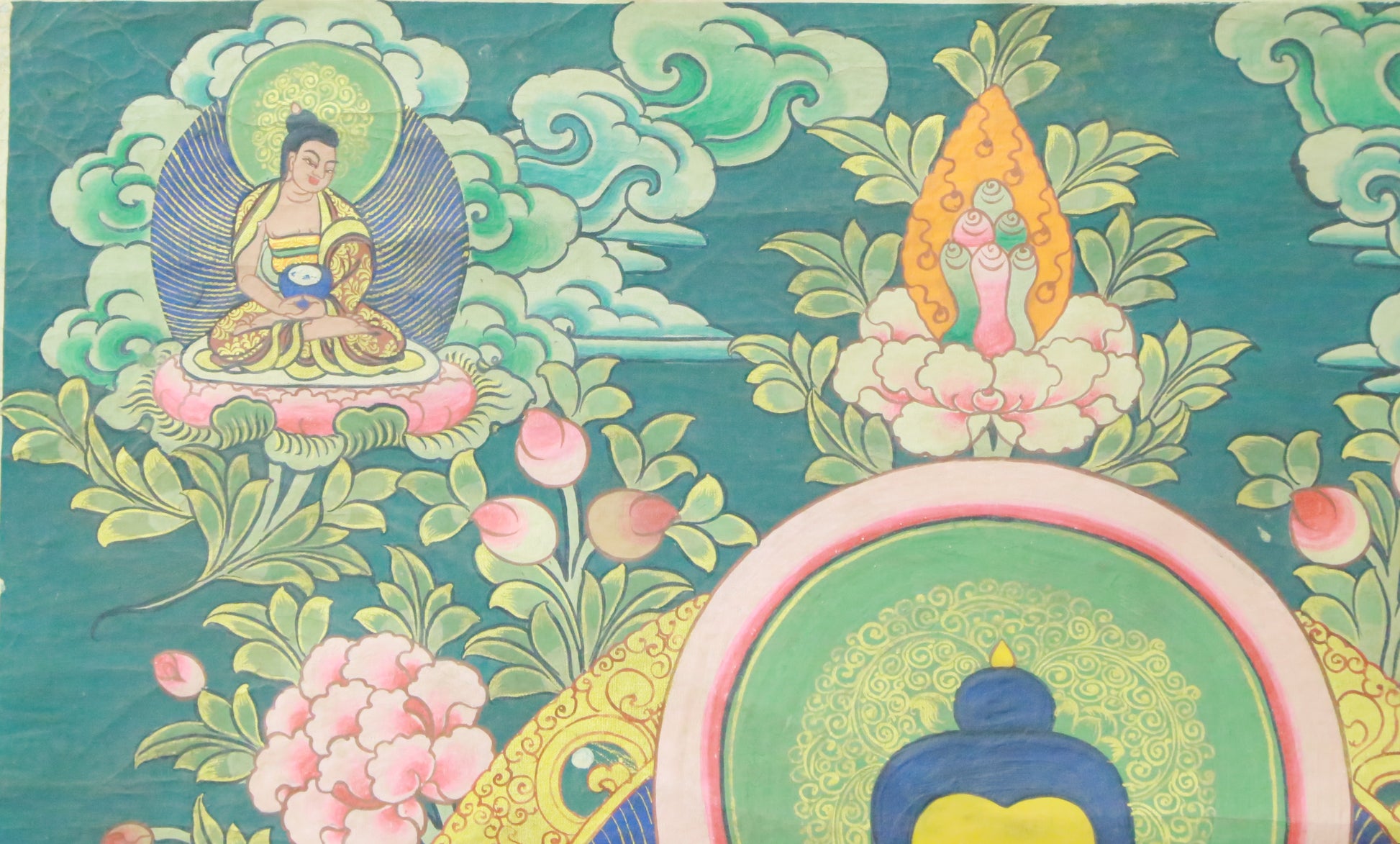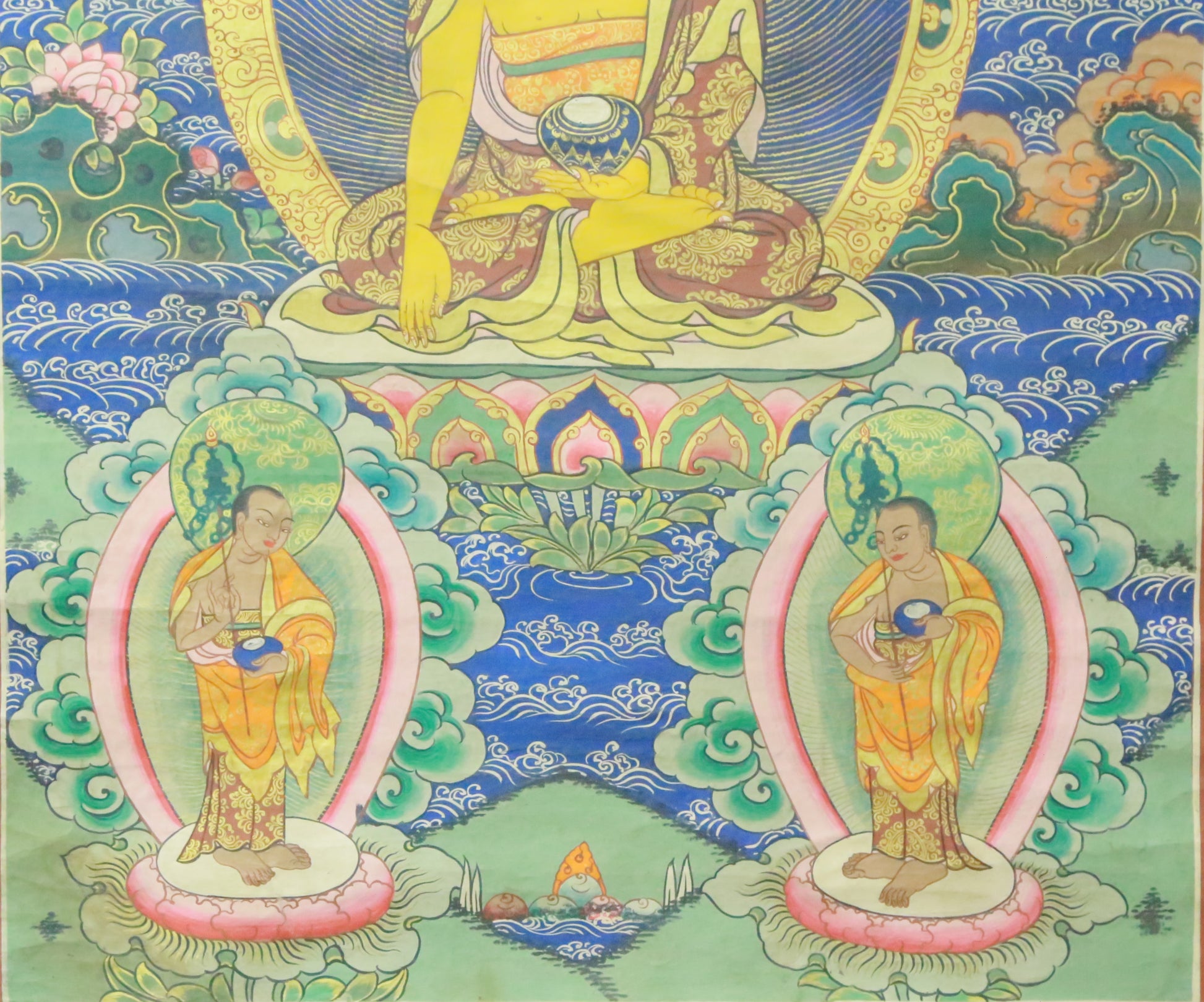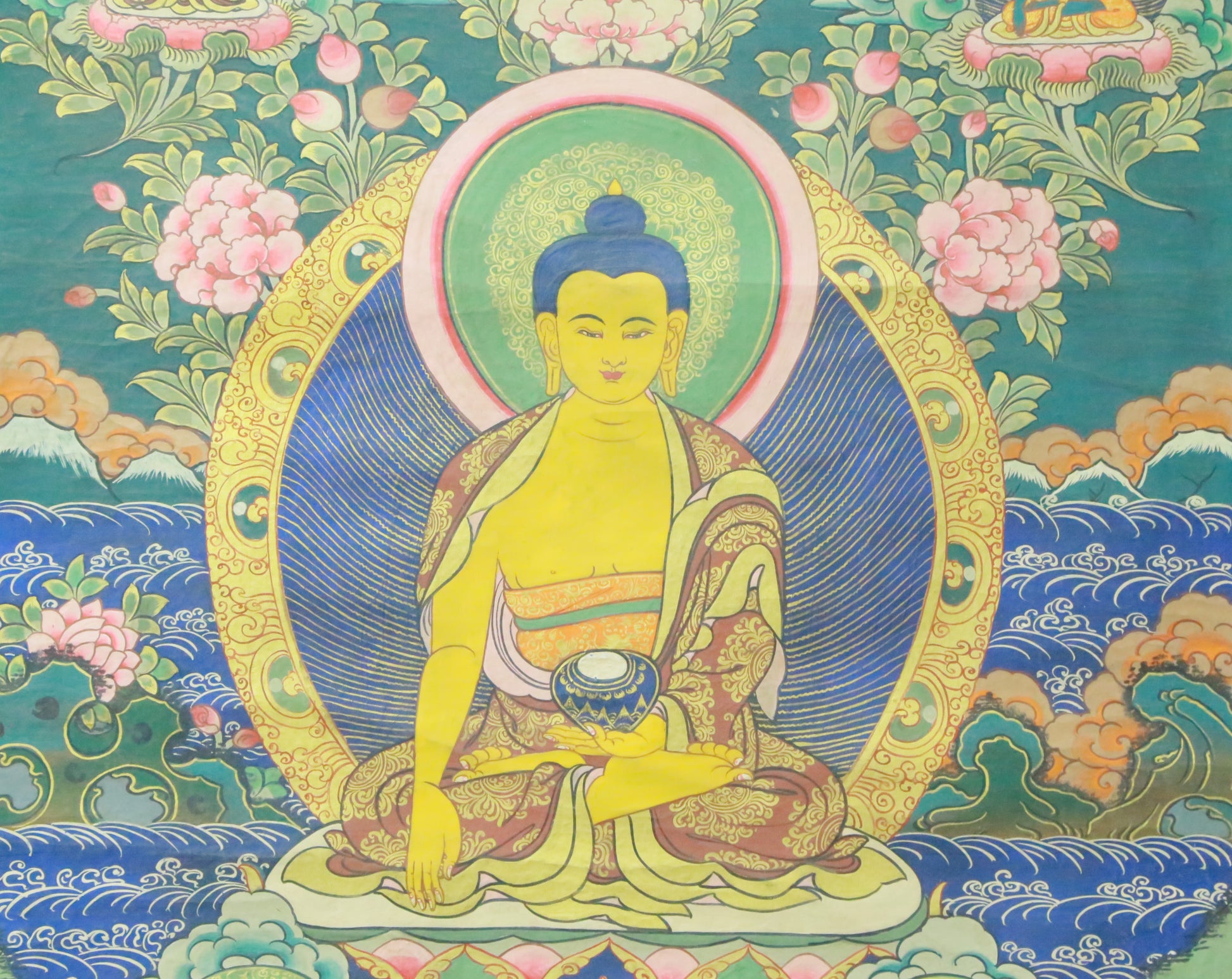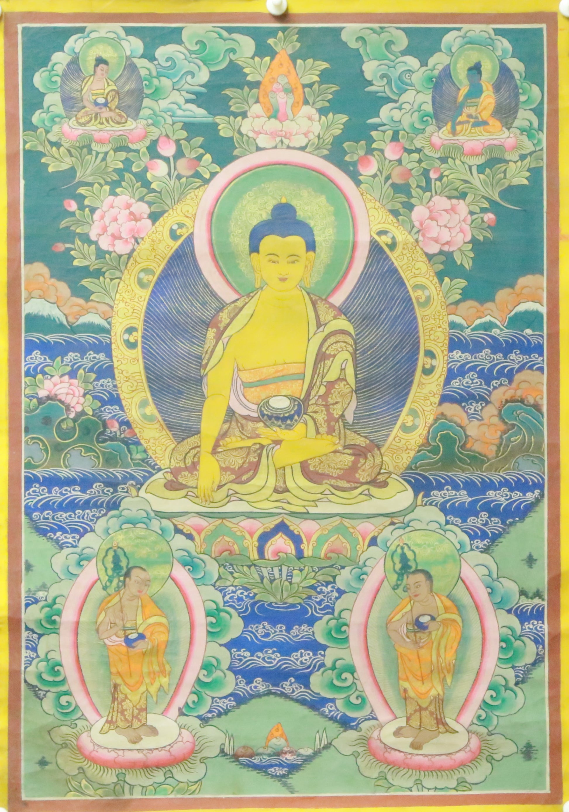 An Exquiste Painted Gold Gautama Buddha Thangka, With inscription, Qing Dynasty, China. Size:54.5cmx77cm     清代  彩绘描金释迦摩尼像唐卡