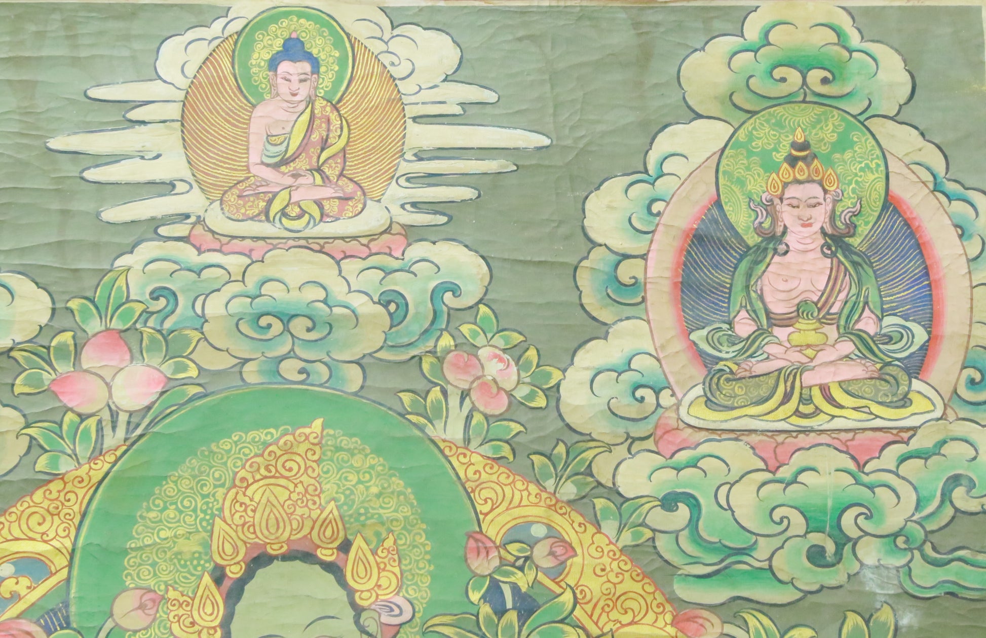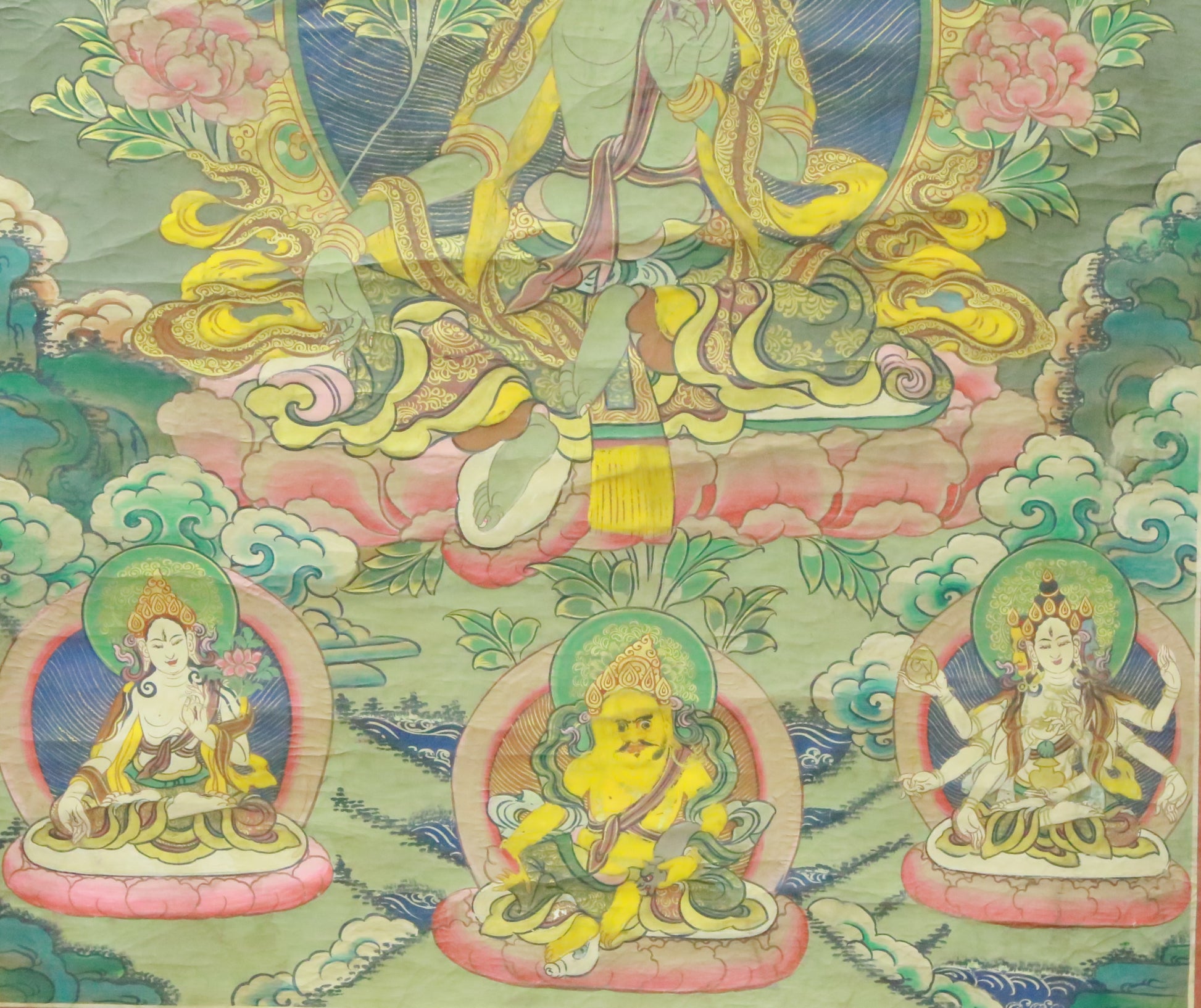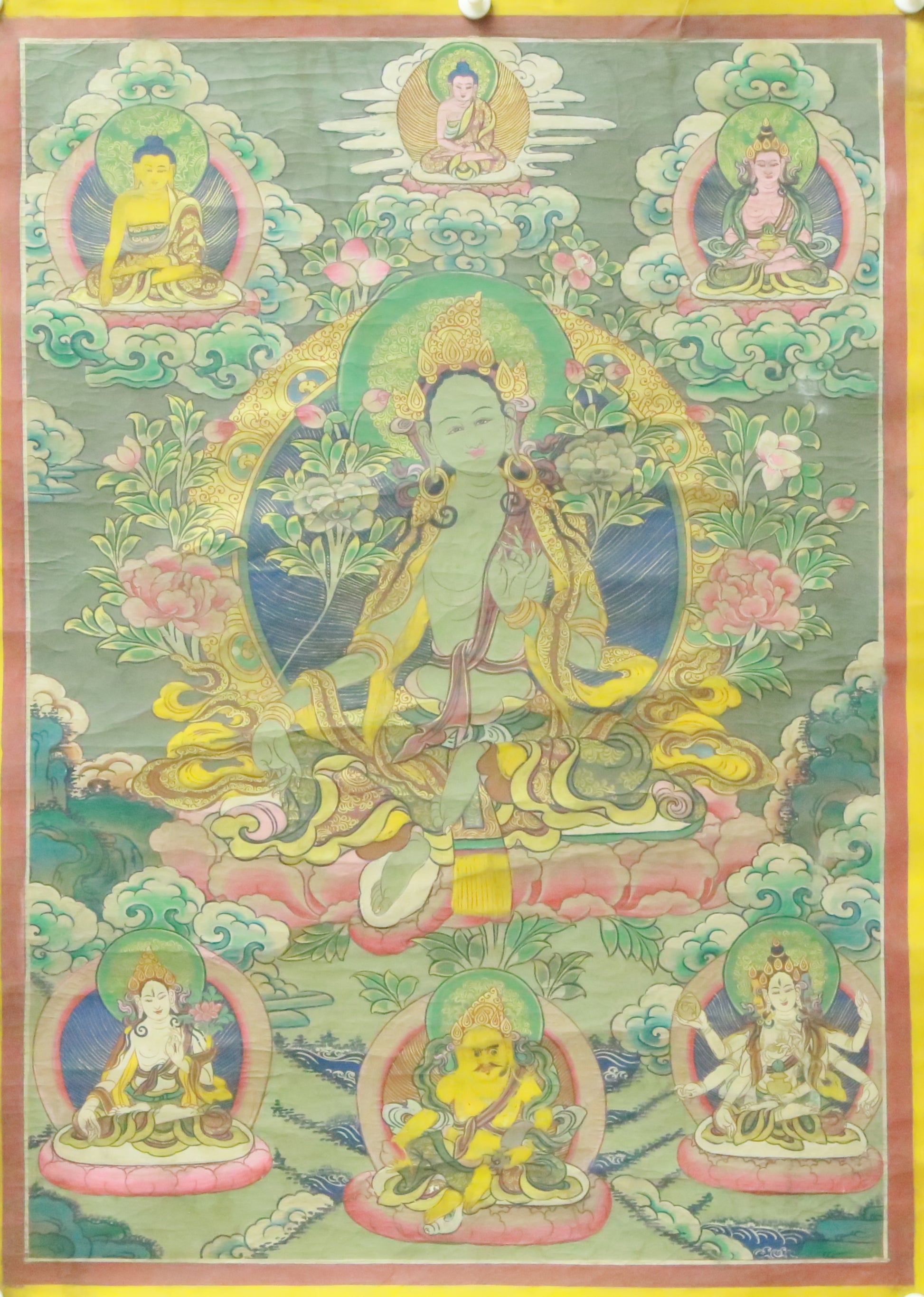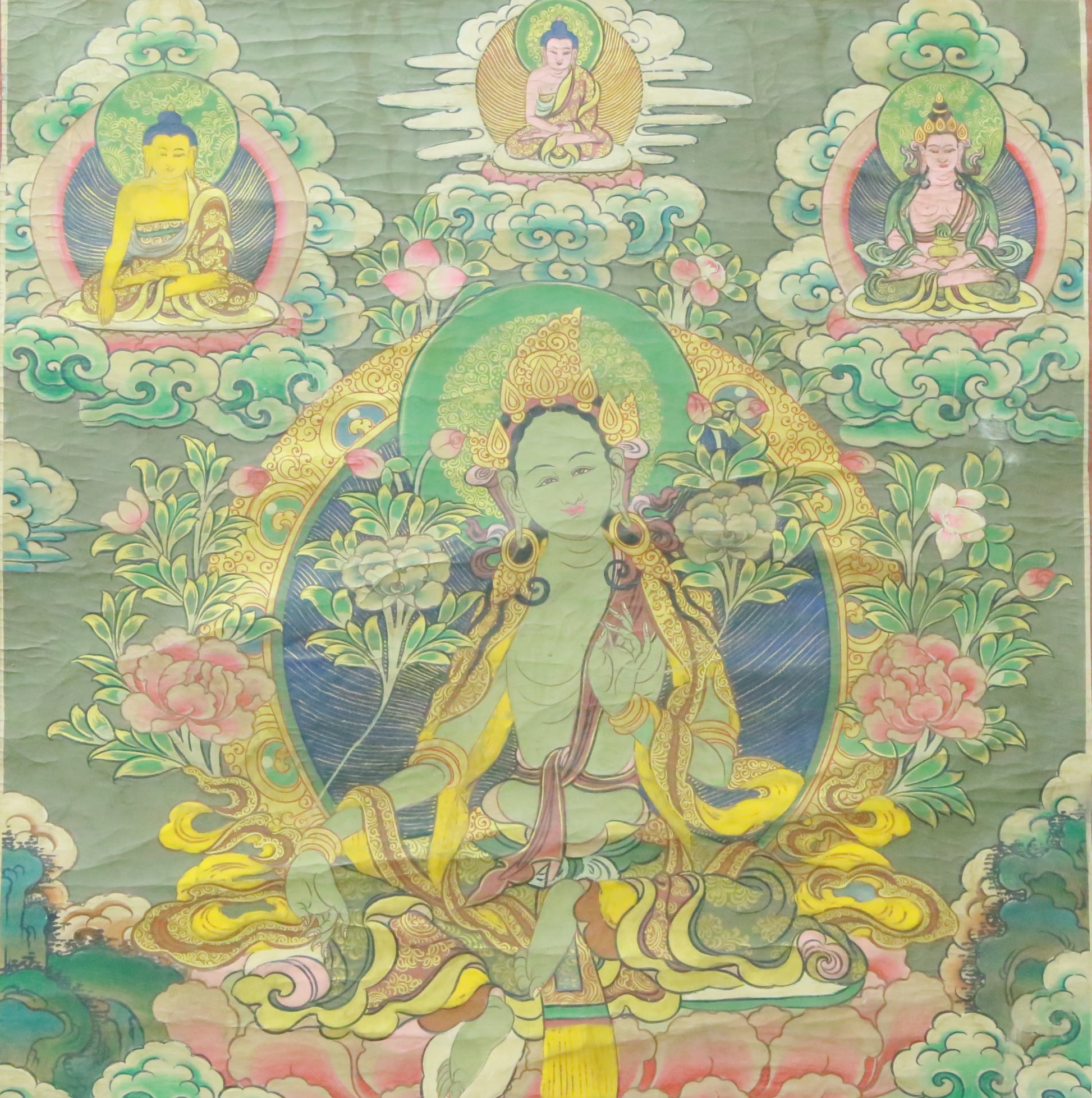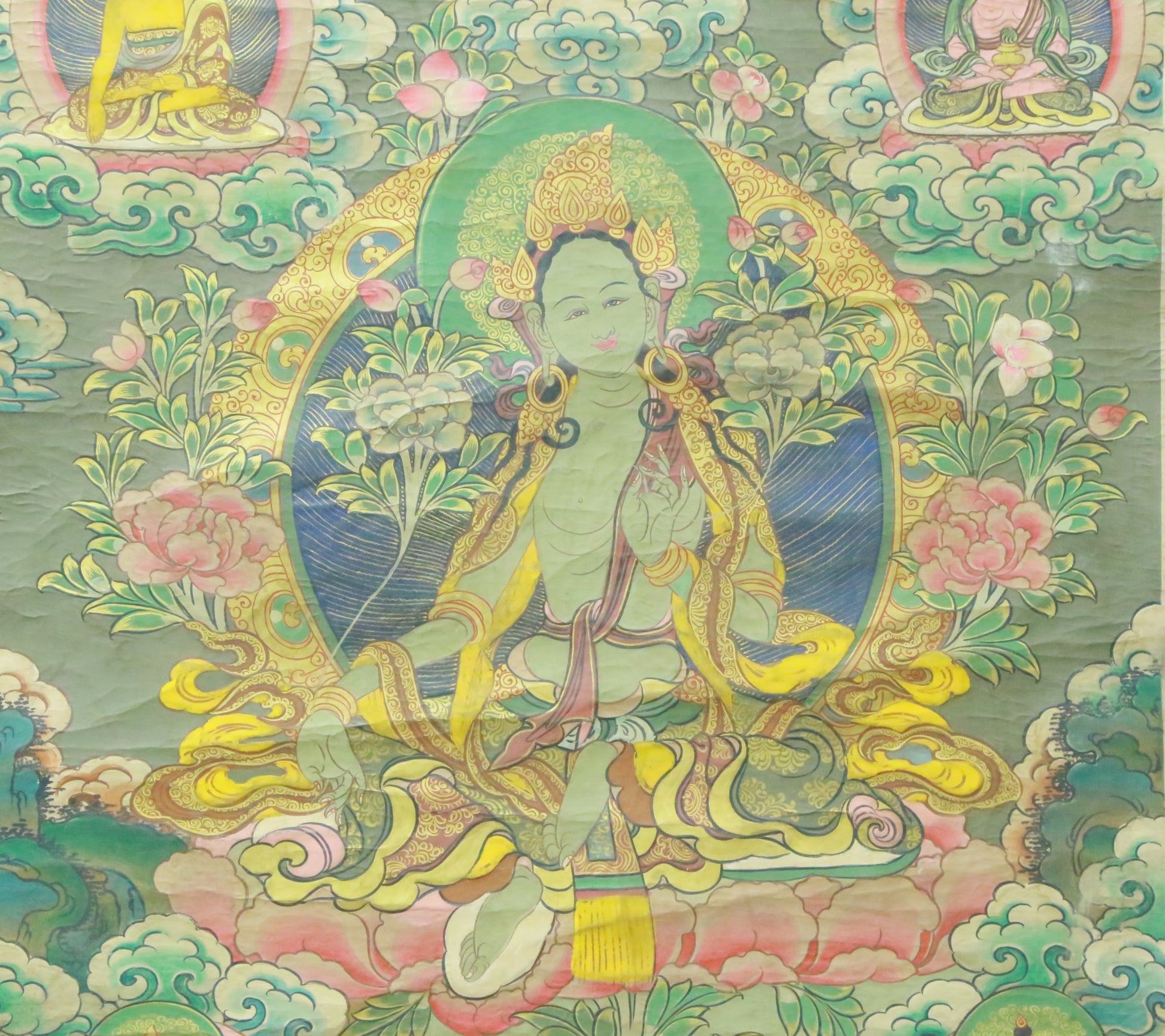 An Exquiste Painted Gold Green Tara Thangka, Qing Dynasty, China. Size:56cmx77cm     清代  彩绘描金绿度母像唐卡