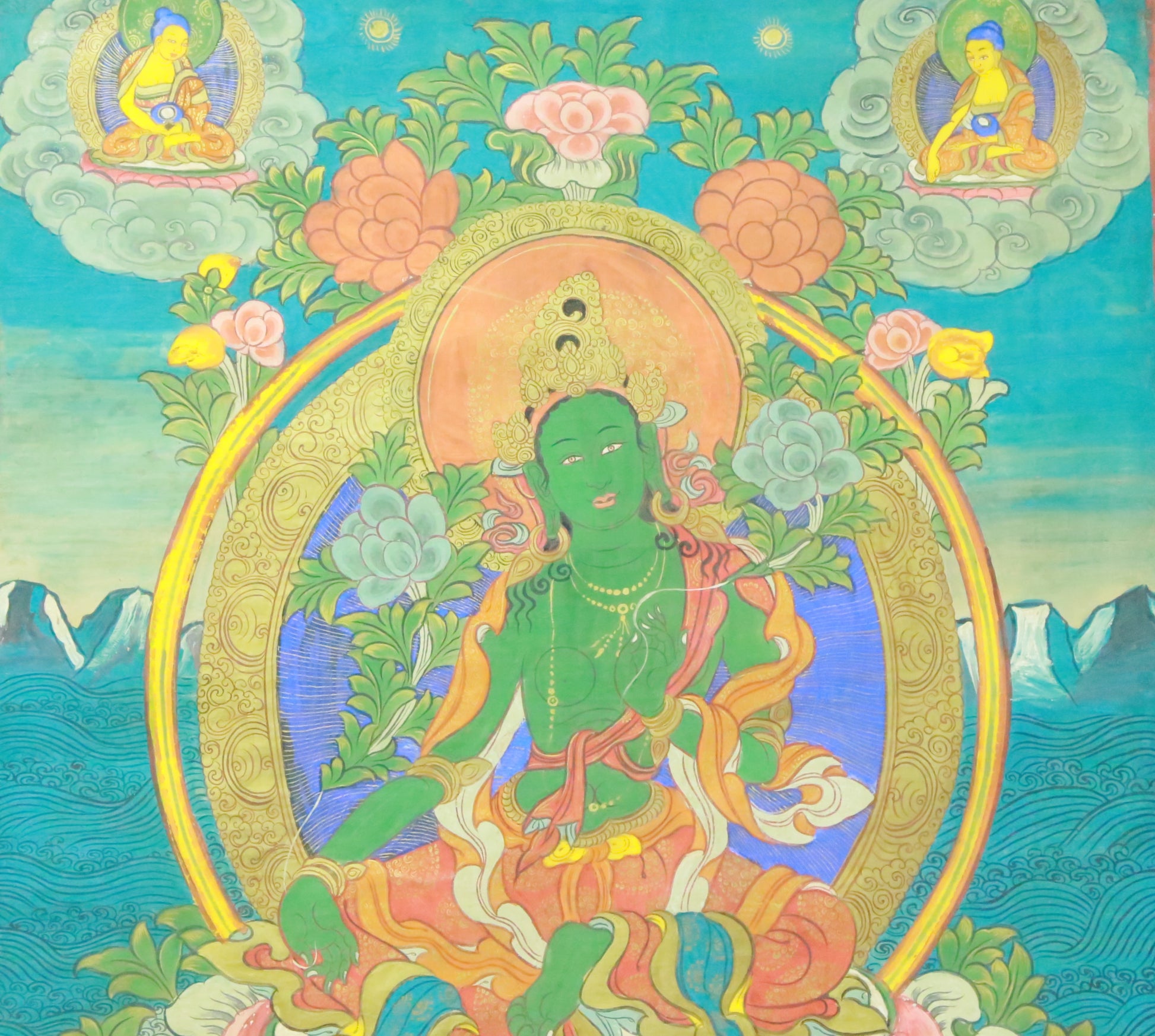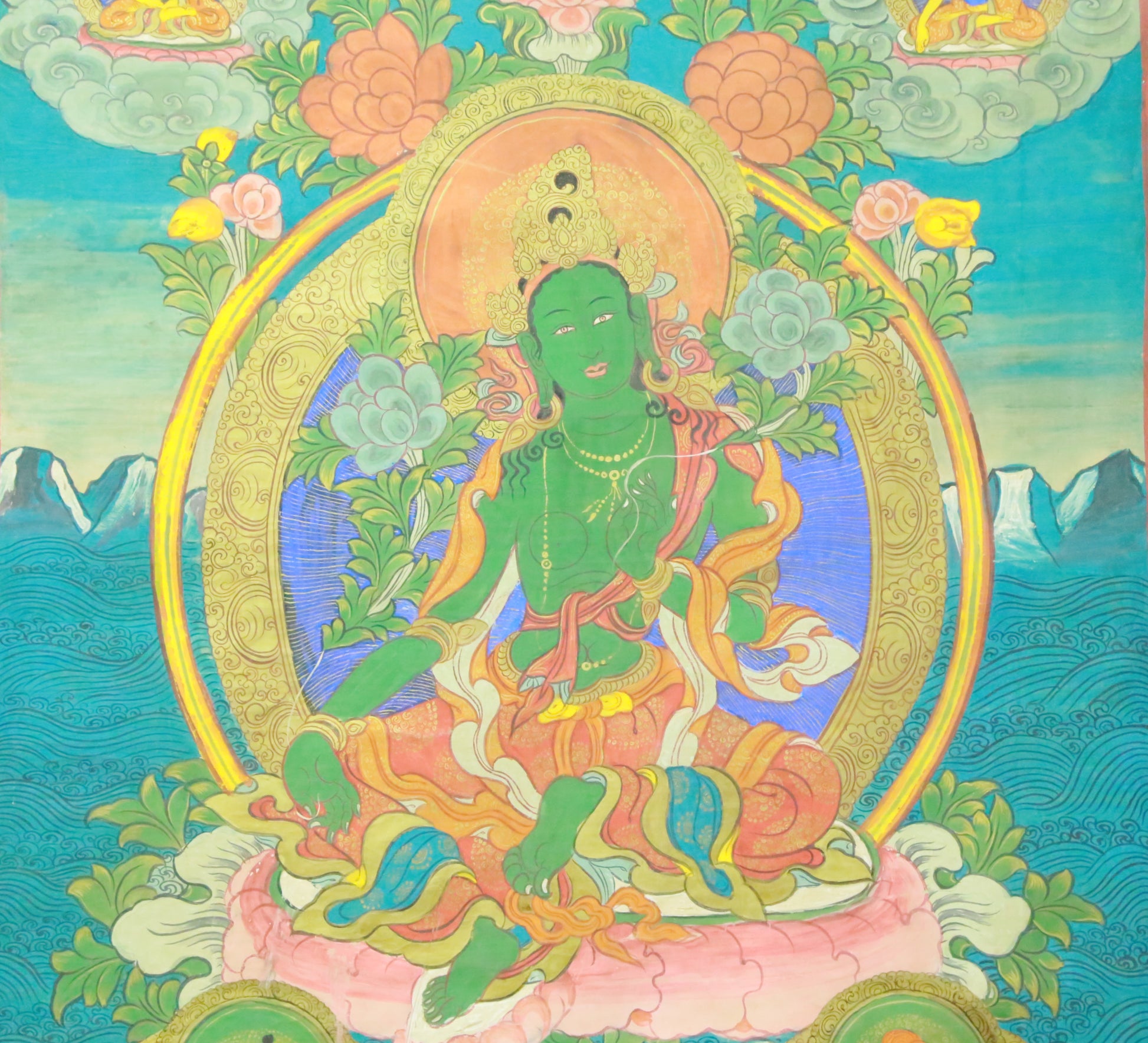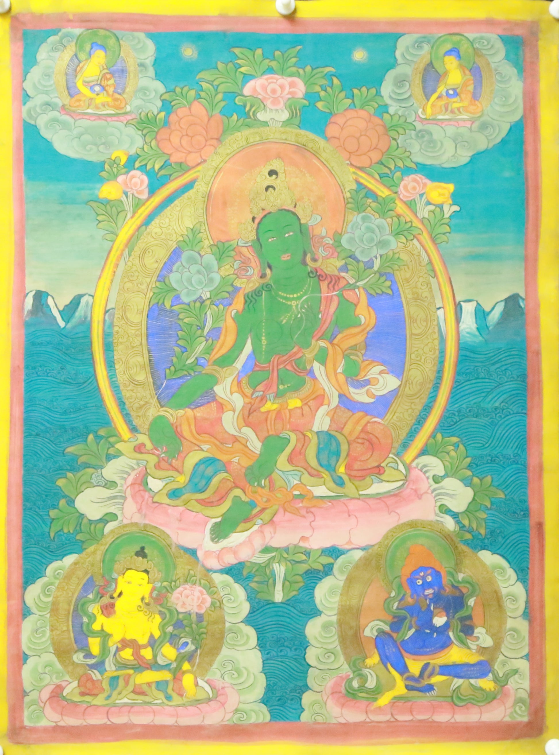 An Exquiste Painted Gold Green Tara Thangka, With inscription, Qing Dynasty, China. Size:56cmx75cm    清代  彩绘描金绿度母像唐卡