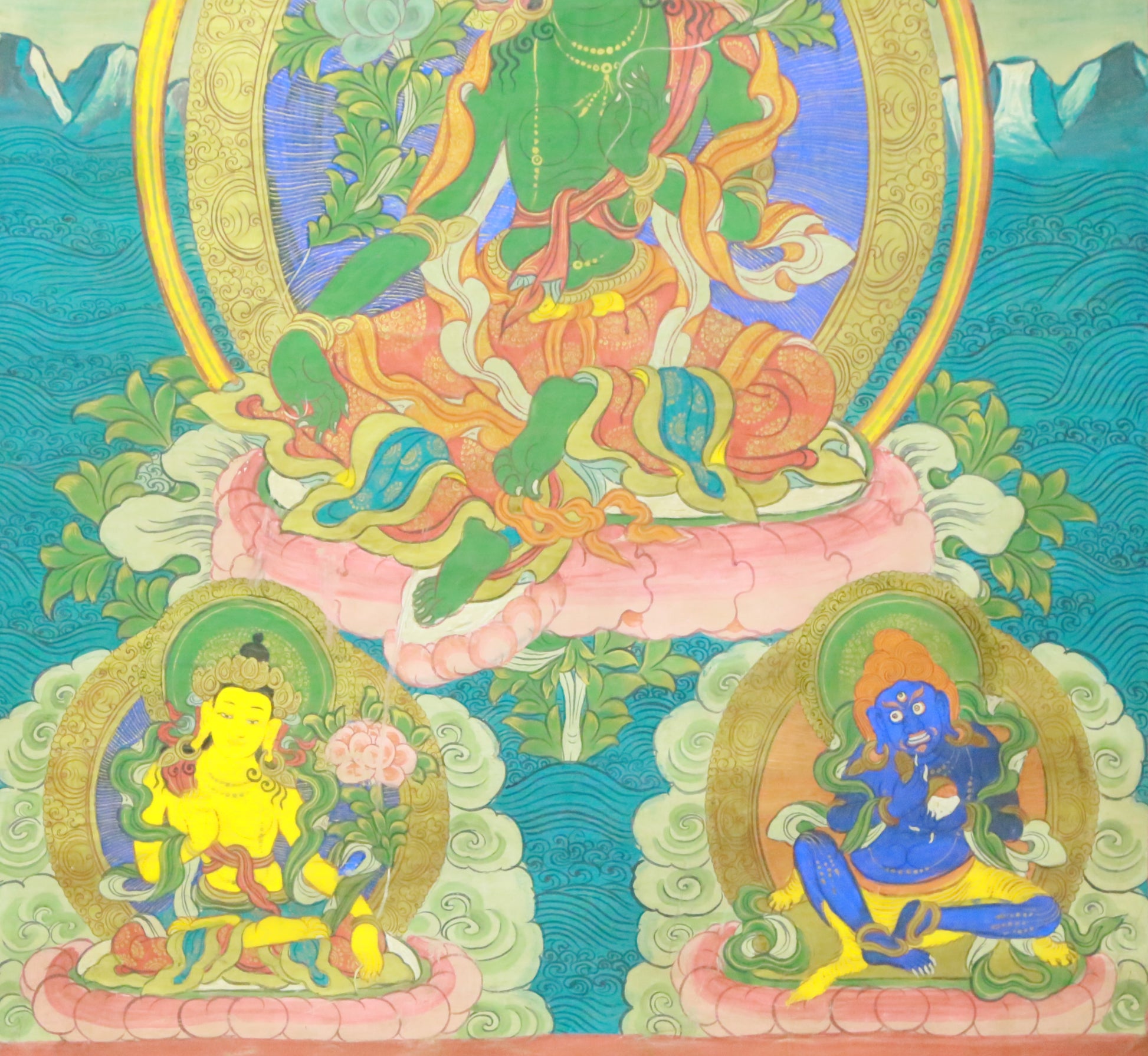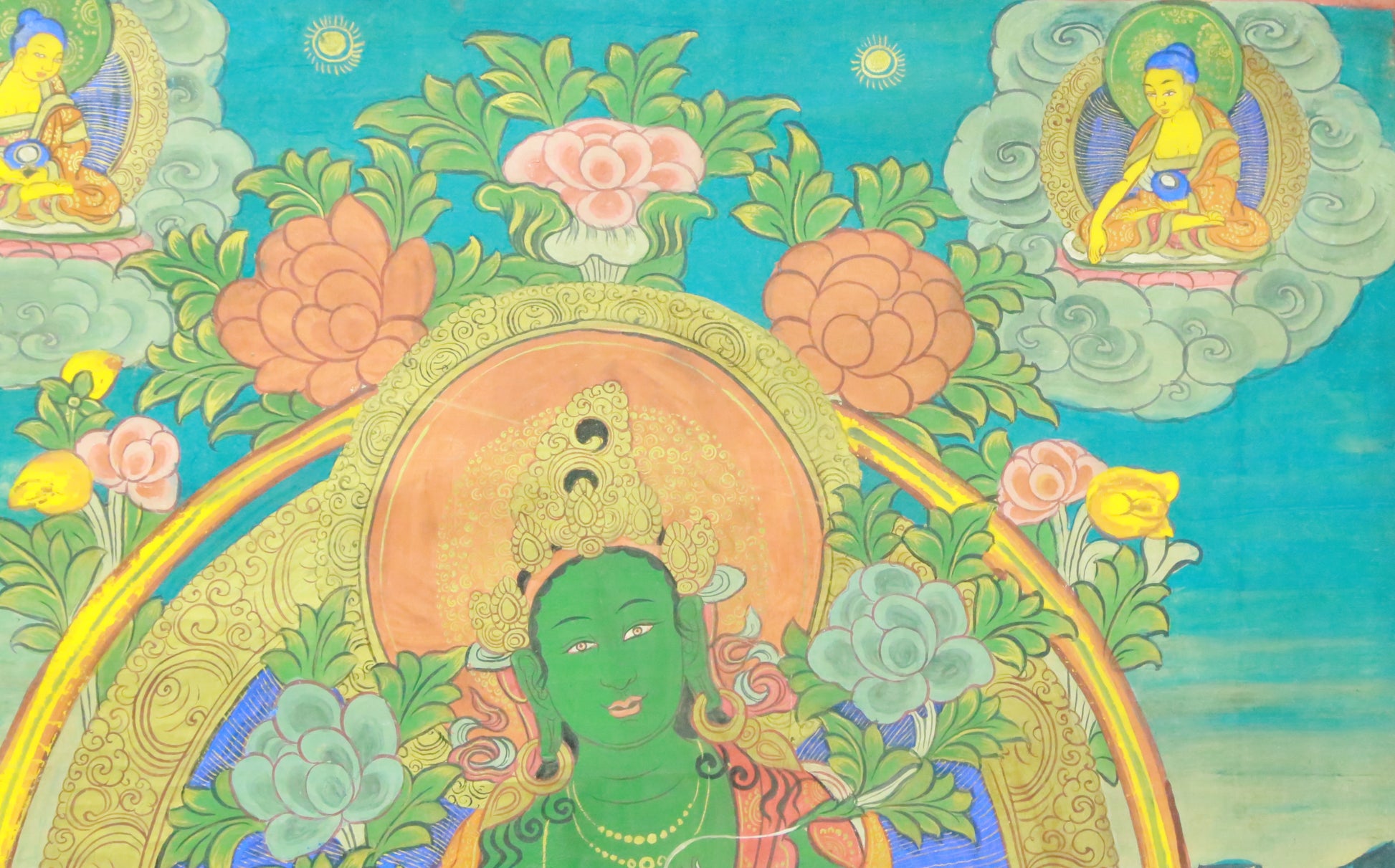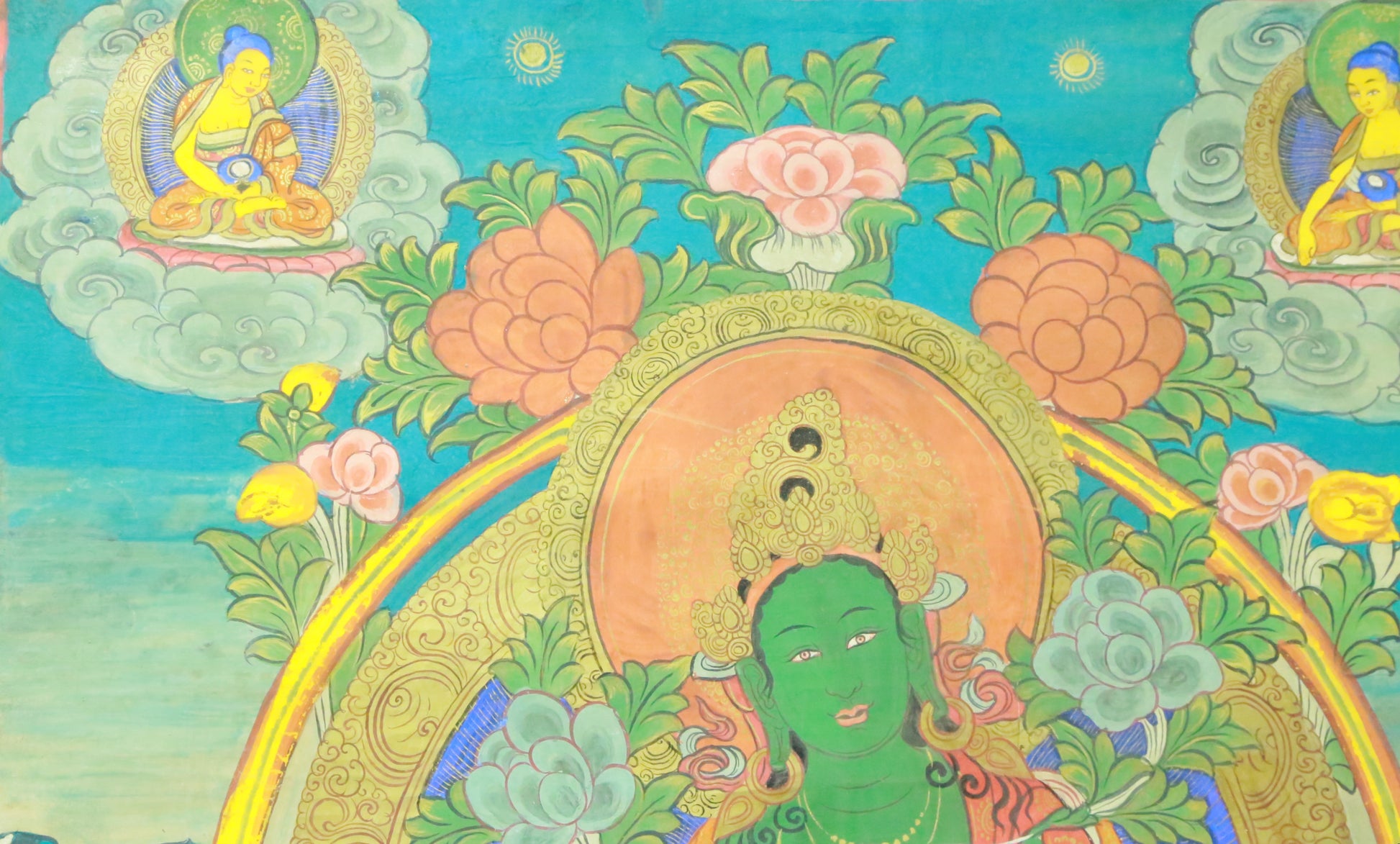 An Exquiste Painted Gold Green Tara Thangka, With inscription, Qing Dynasty, China. Size:56cmx75cm    清代  彩绘描金绿度母像唐卡
