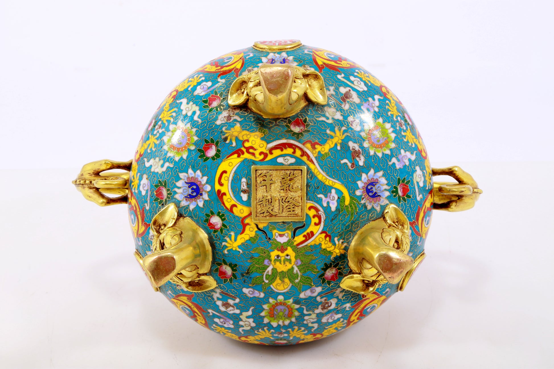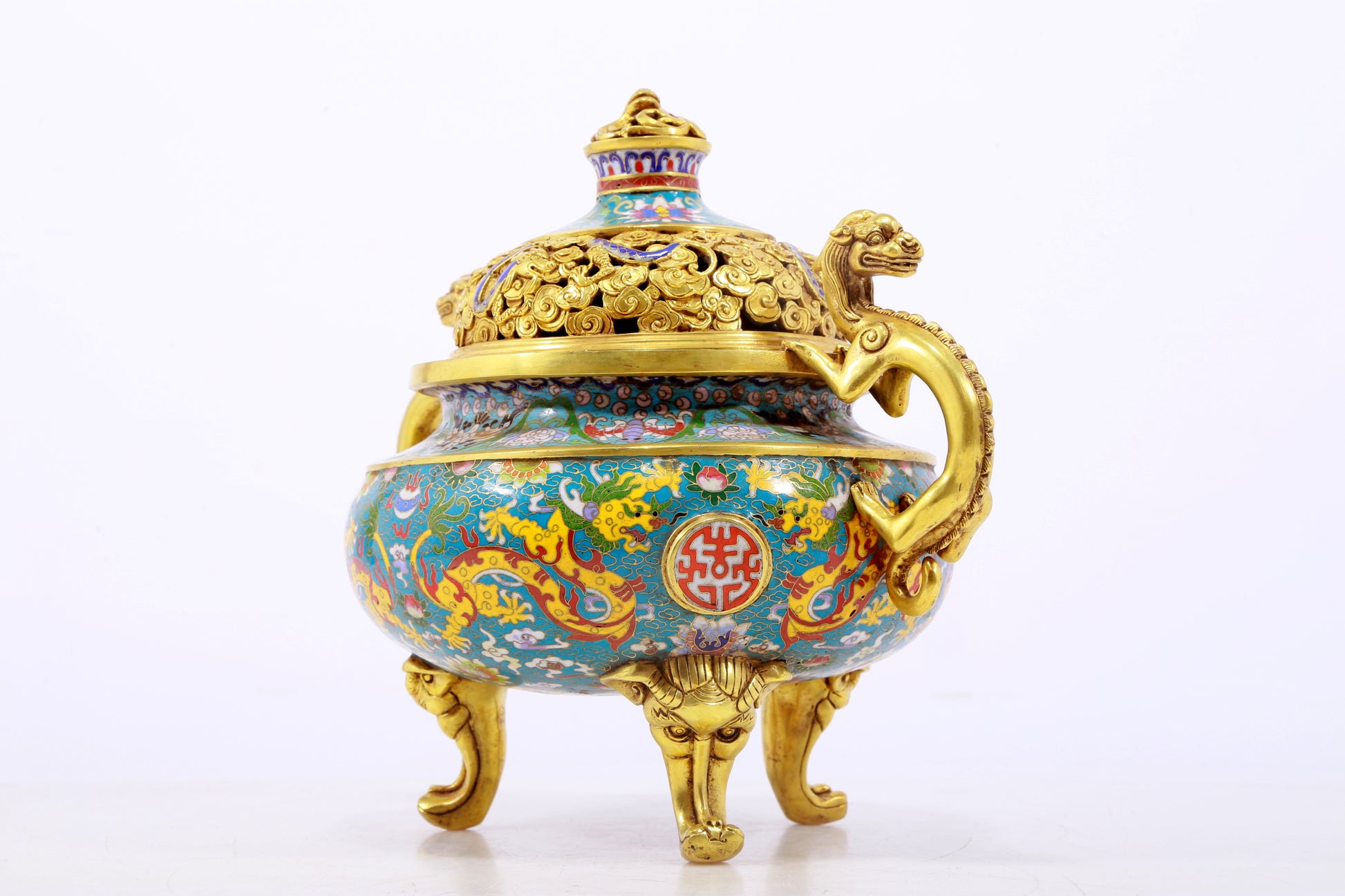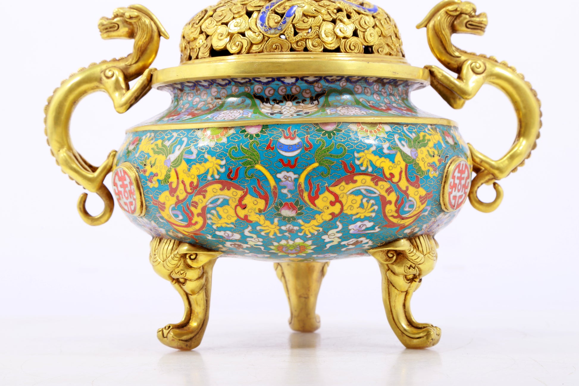 An exquisite cloisonné 'lily and dragon' pattern two-eared tripod censer with lid