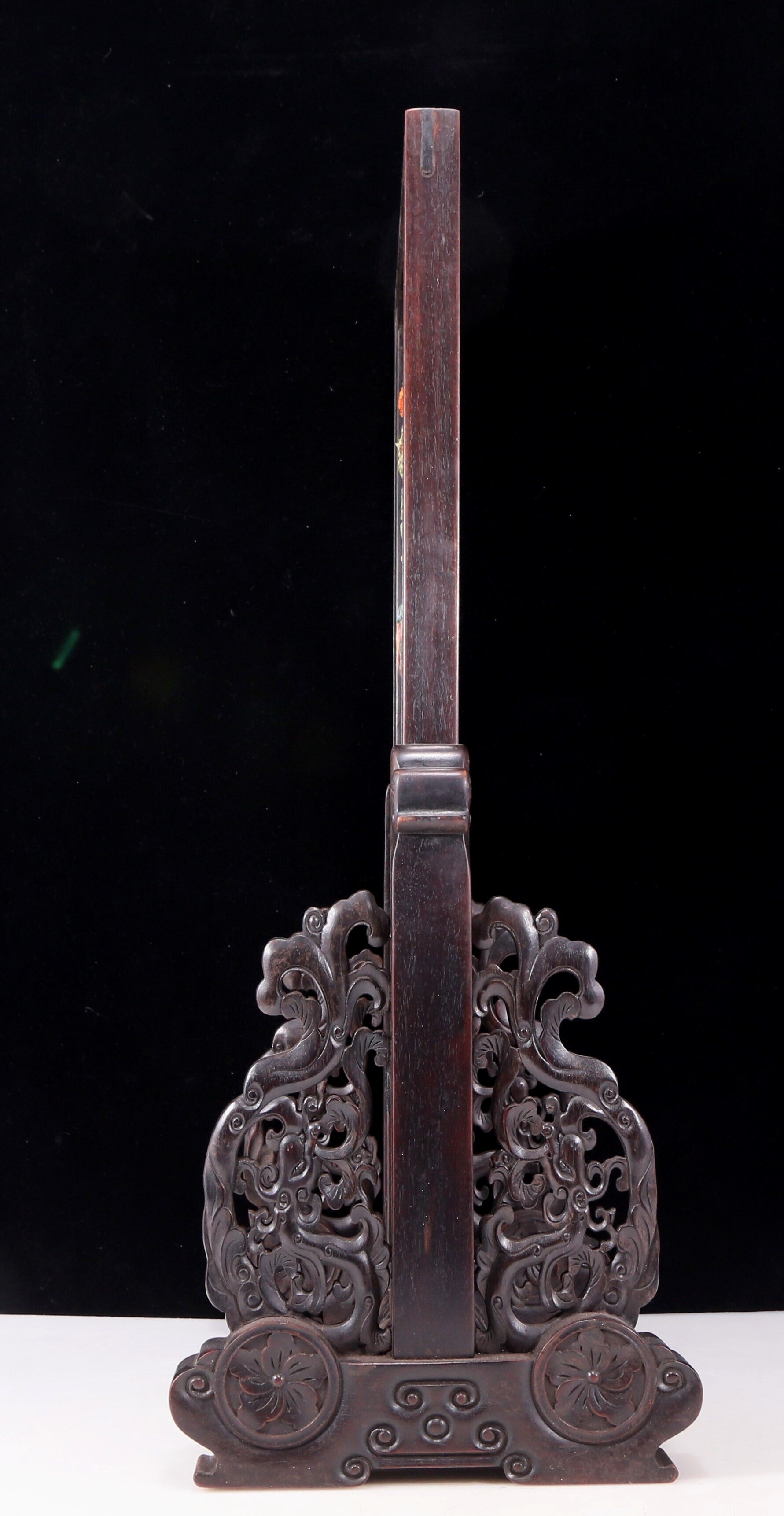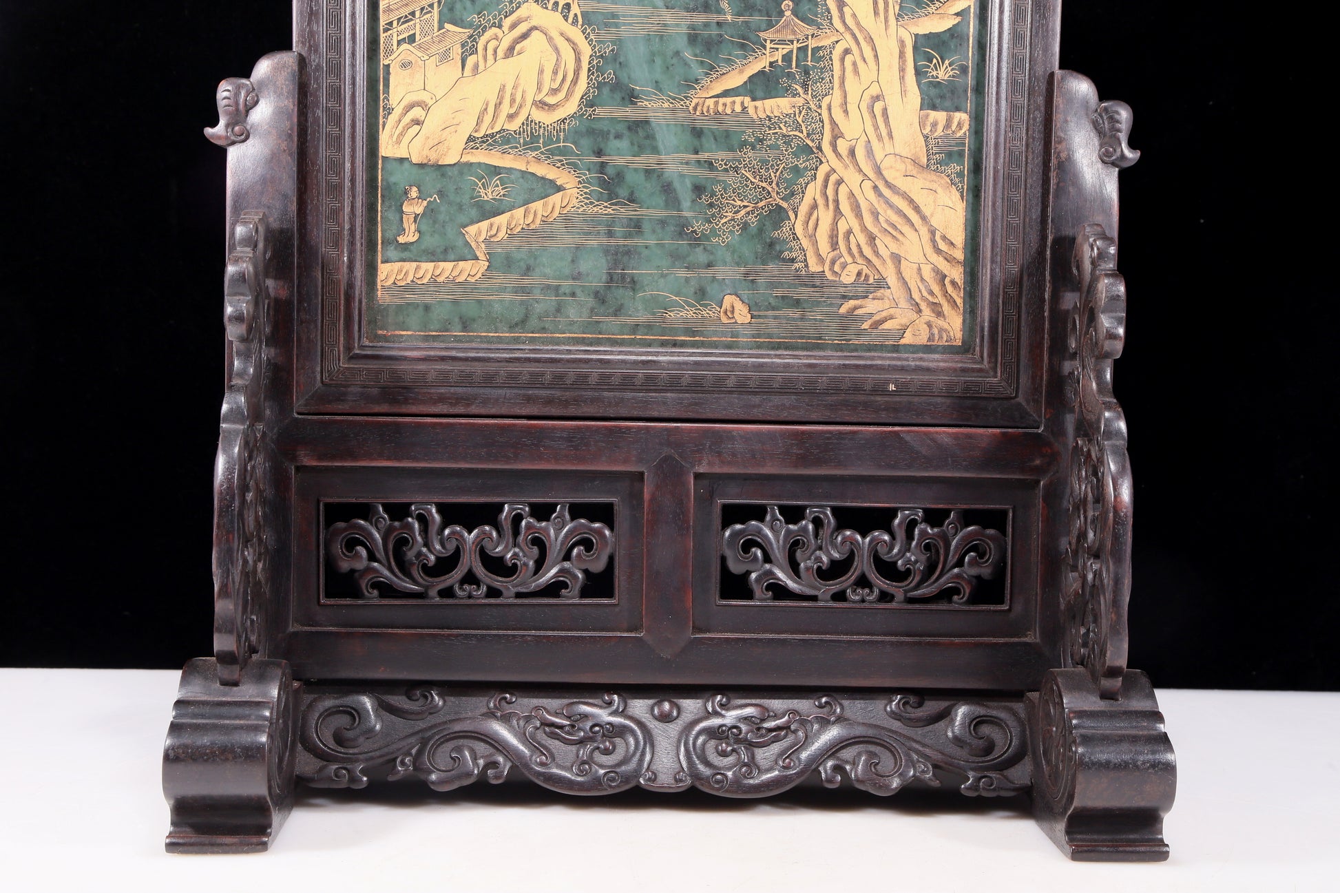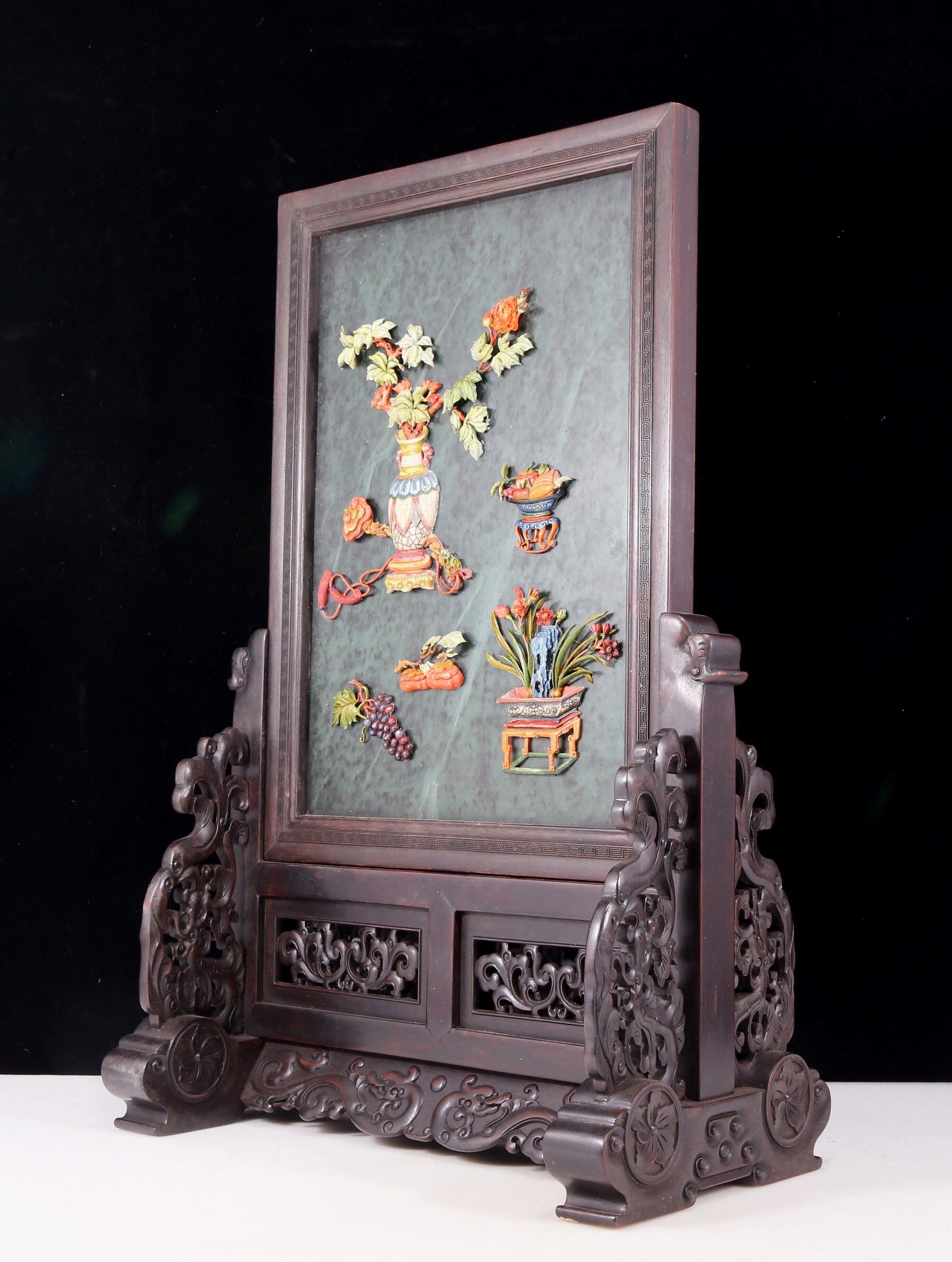 An exquisite zitanwood inlaid with jasper and gold inlaid gemstone vase pattern table screen