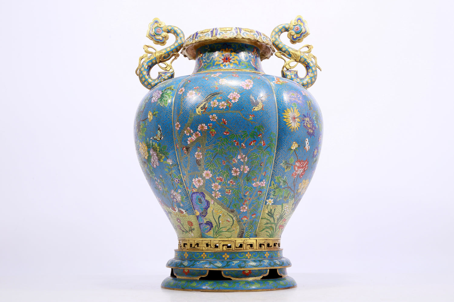 A cloisonné flower and bird pattern two-eared three-legged incense burner with lid