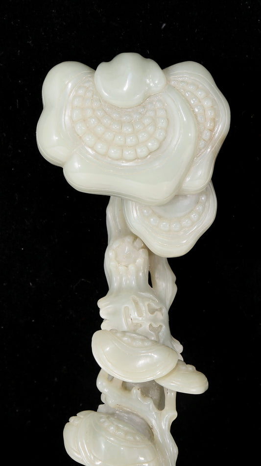 An exquisite white jade elephant ear vase with flower and bird patterns and lid