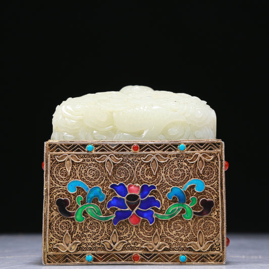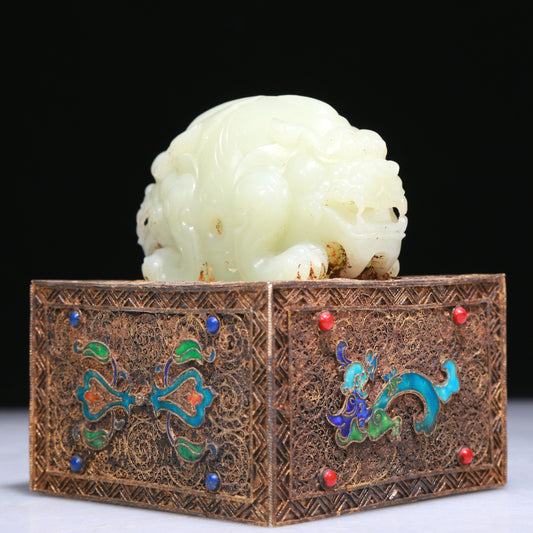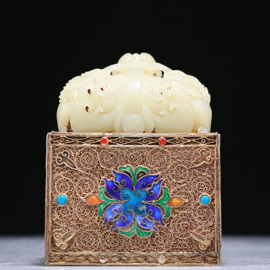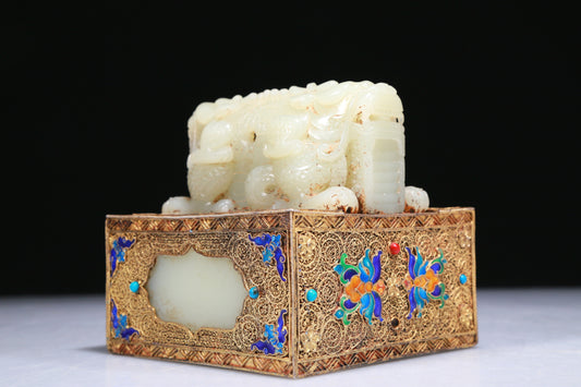 An Exquisite White Jade Gold-Mounted Blueing 'Dragon' Seal