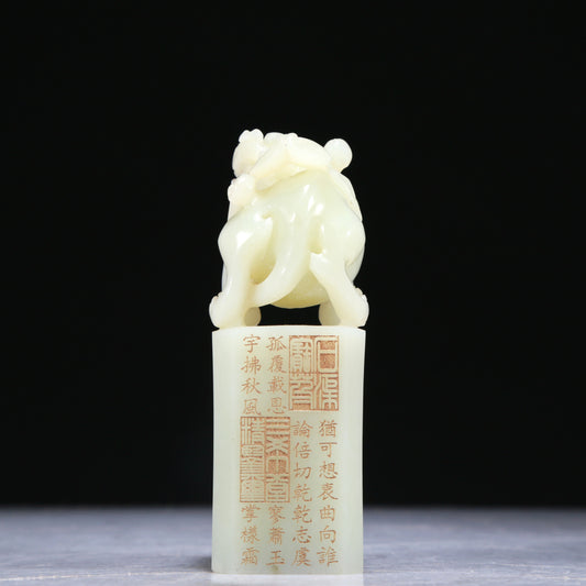 An Exquisite White Jade 'Lion' Seal With Poem Inscriptions