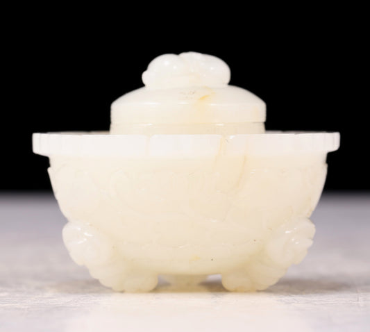 An exquisite white jade tripod censer with flower and bird patterns and lid