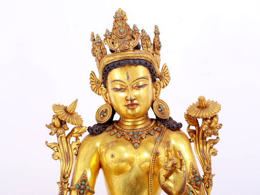 majestic gilt bronze statue of White Tara inlaid with turquoise