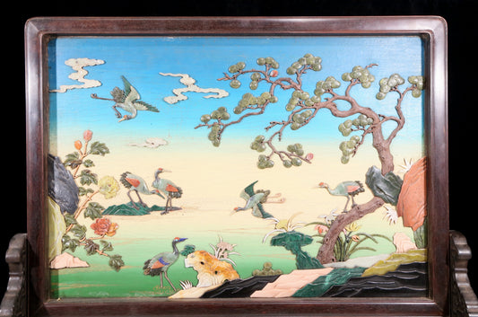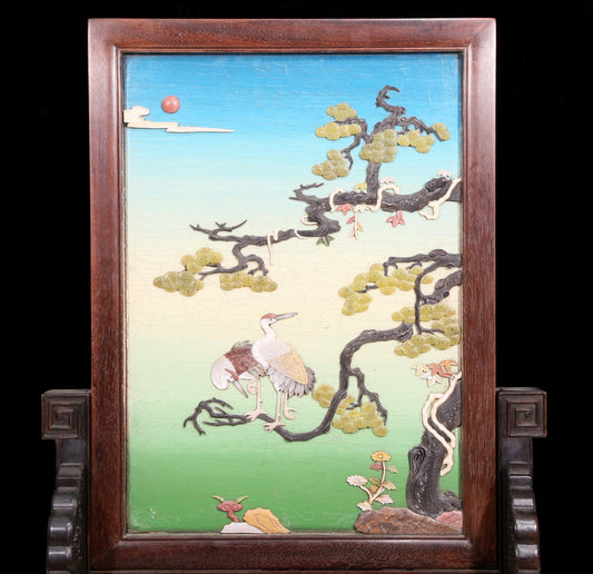 An exquisite zitanwood lacquered and gold-embedded pine and crane pattern table screen