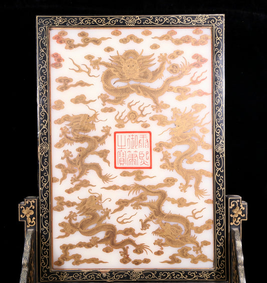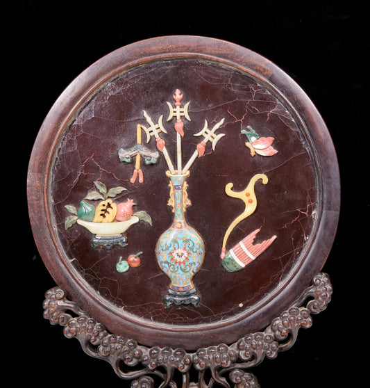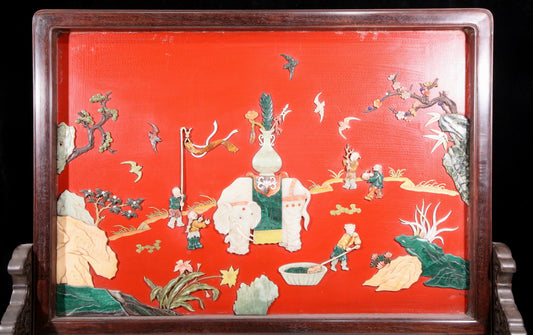 An exquisite zitanwood table screen inlaid with jasper dragon patterns