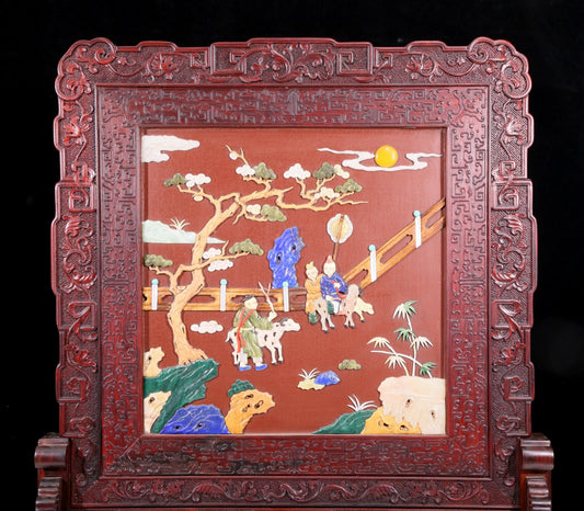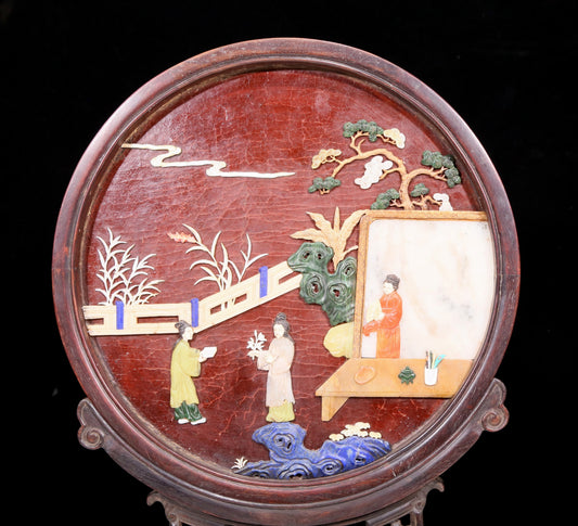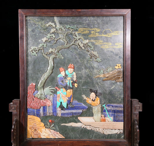An exquisite zitanwood table screen filled with lacquer, painted with gold and inlaid with white jade with landscape and figure patterns.