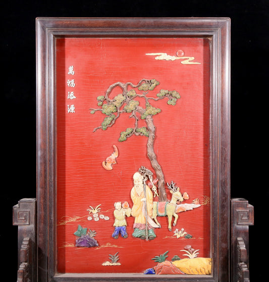 An exquisite zitanwood lacquered, gold-embedded and birthday-celebrating pattern table screen