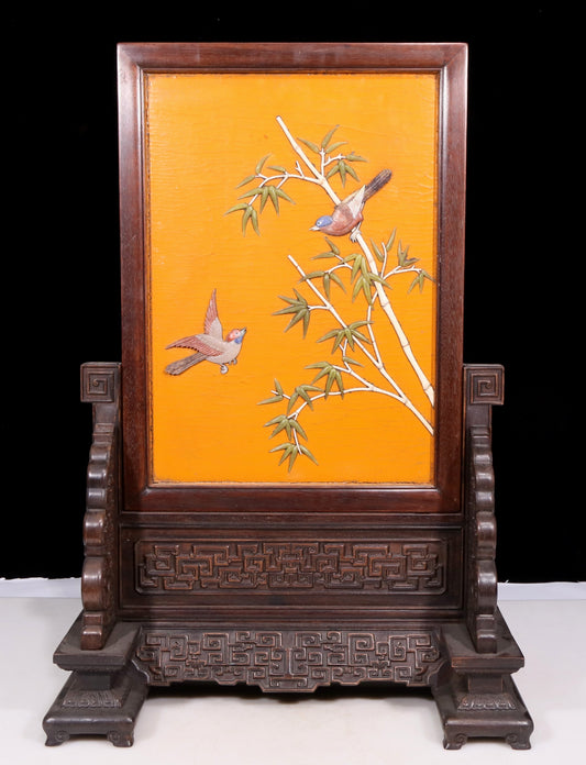 An exquisite zitanwood lacquered, gold-embedded, flower-and-bird pattern table screen