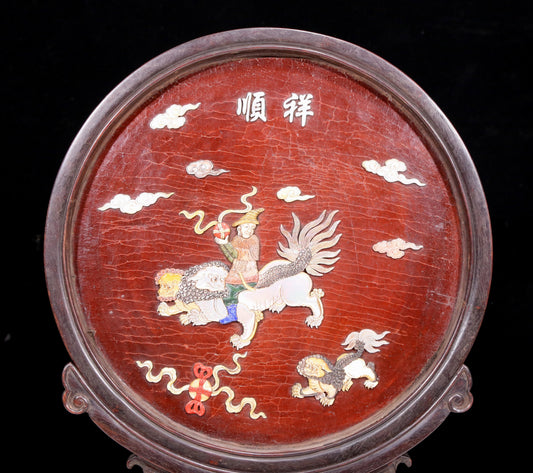 An exquisite zitanwood lacquered and gold-embedded table screen with a lion opera pattern.
