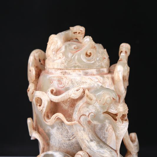 An Elaborate White Jade 'Dragon' Tripod Jar