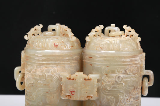 An Archaic Yellow Jade 'Animal Mask' Double-Jar And Cover