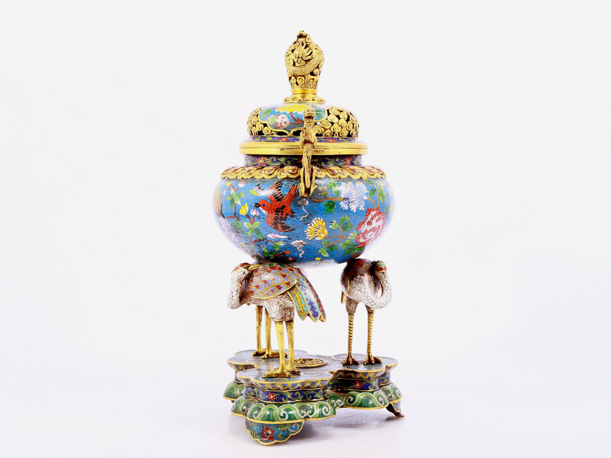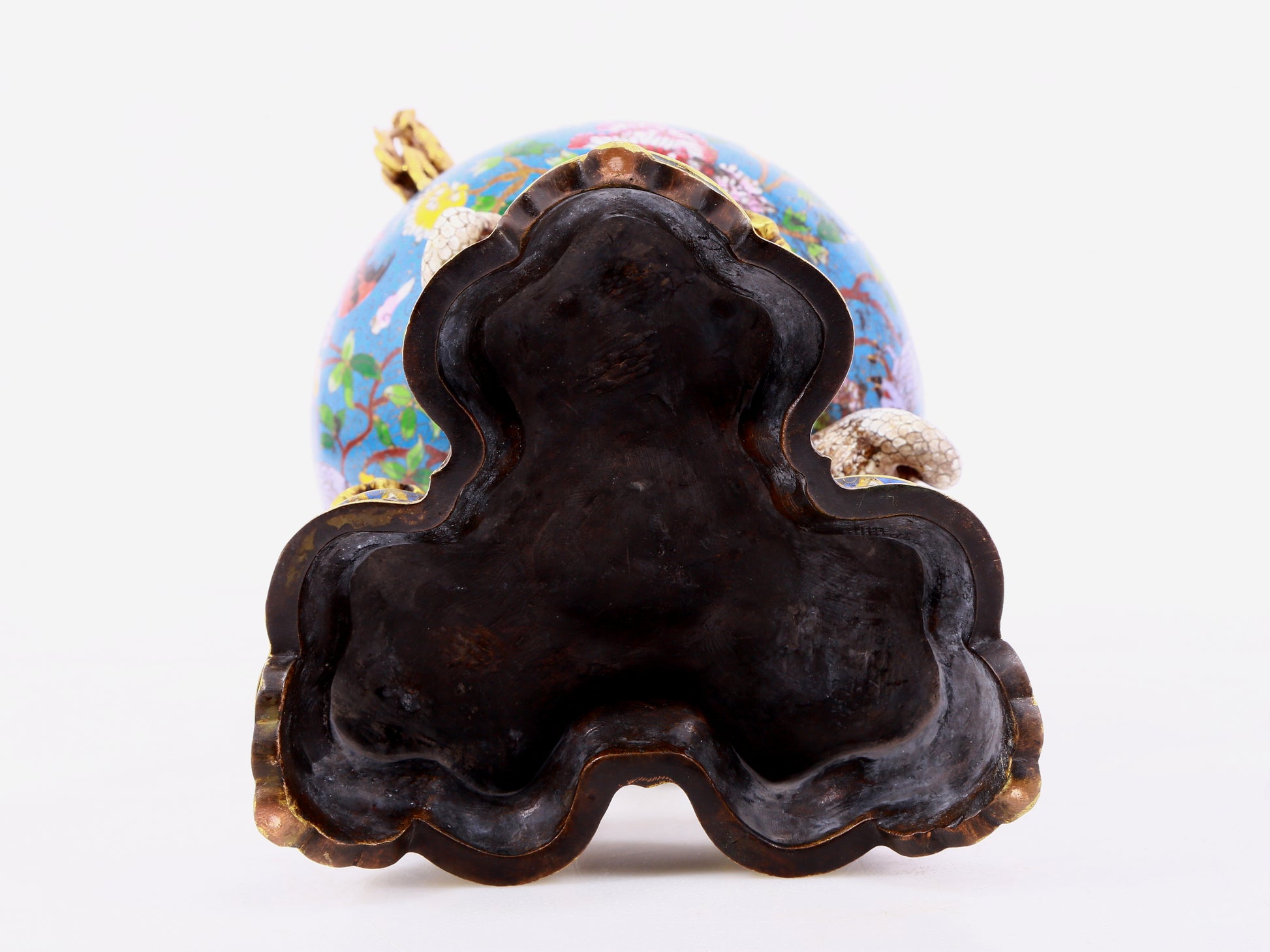 A cloisonné flower and bird pattern two-eared three-legged incense burner with lid