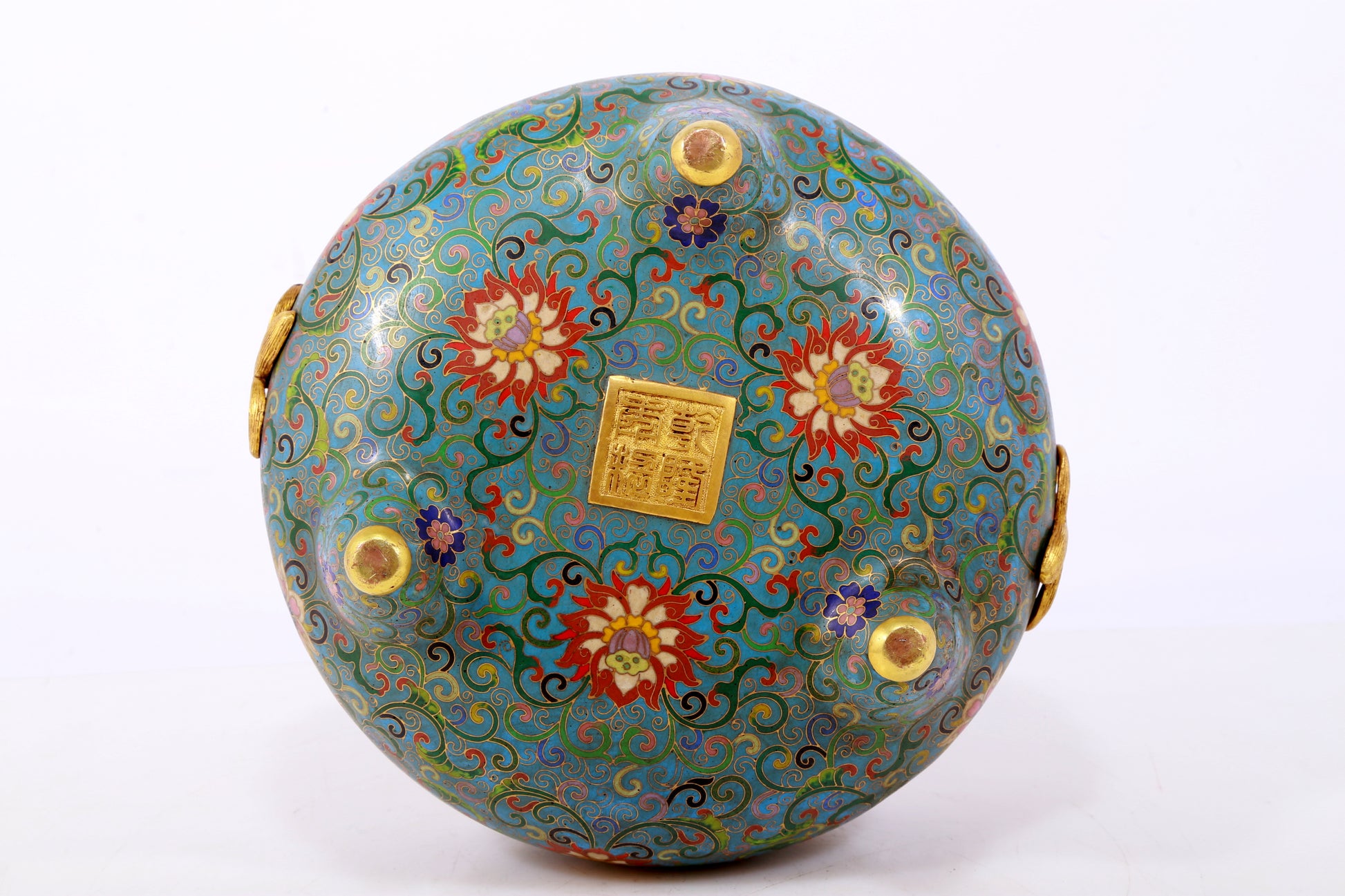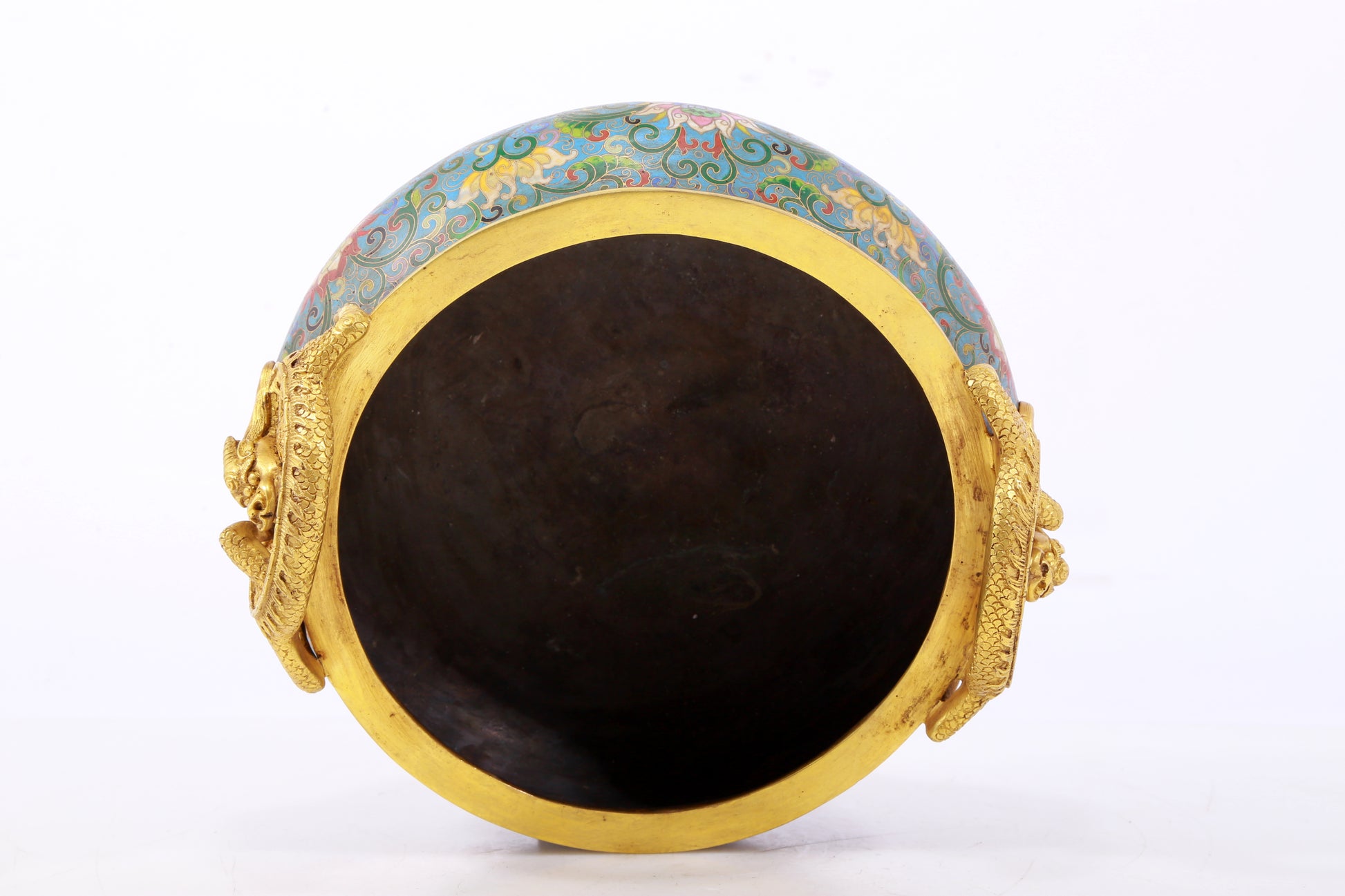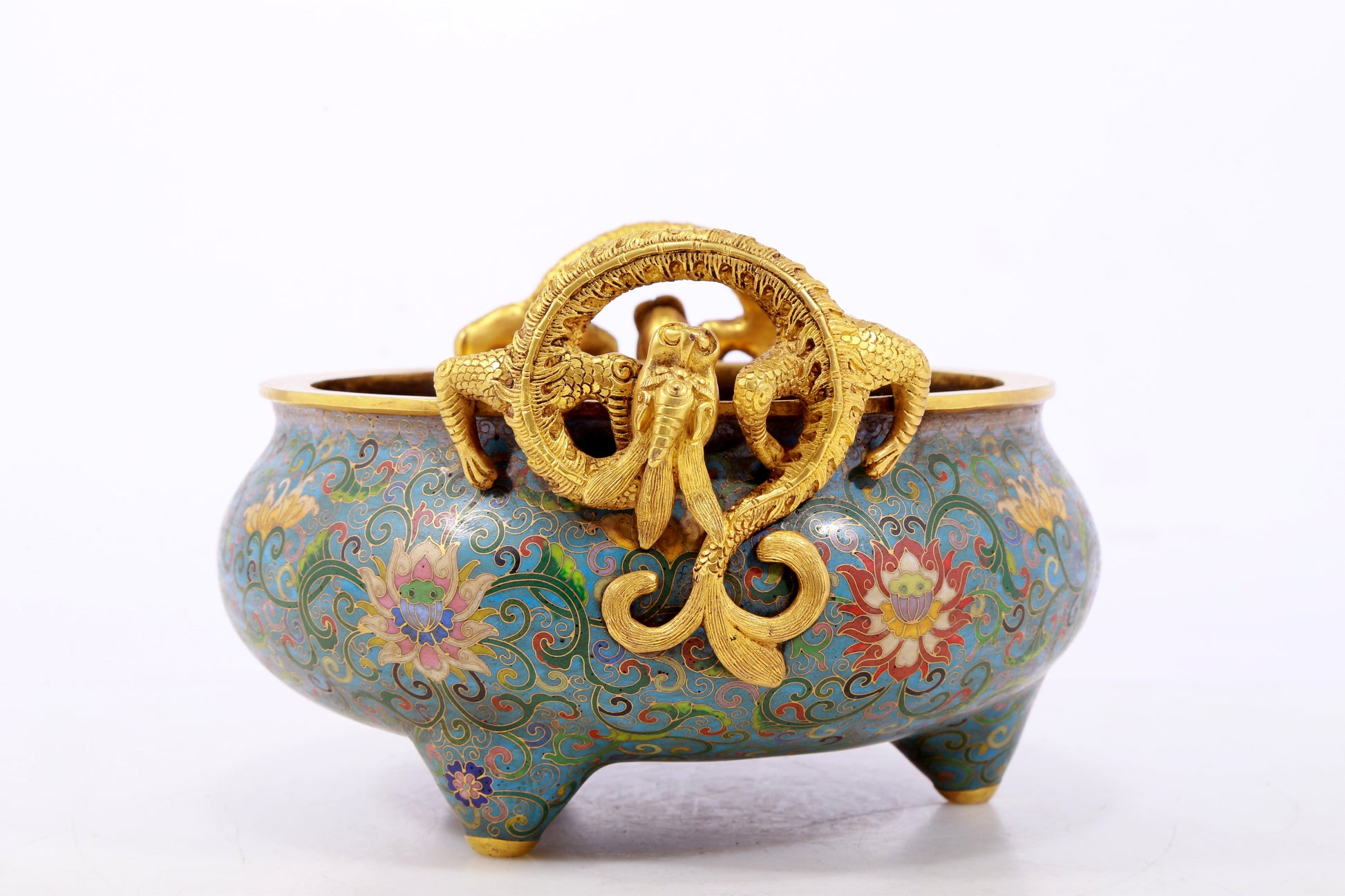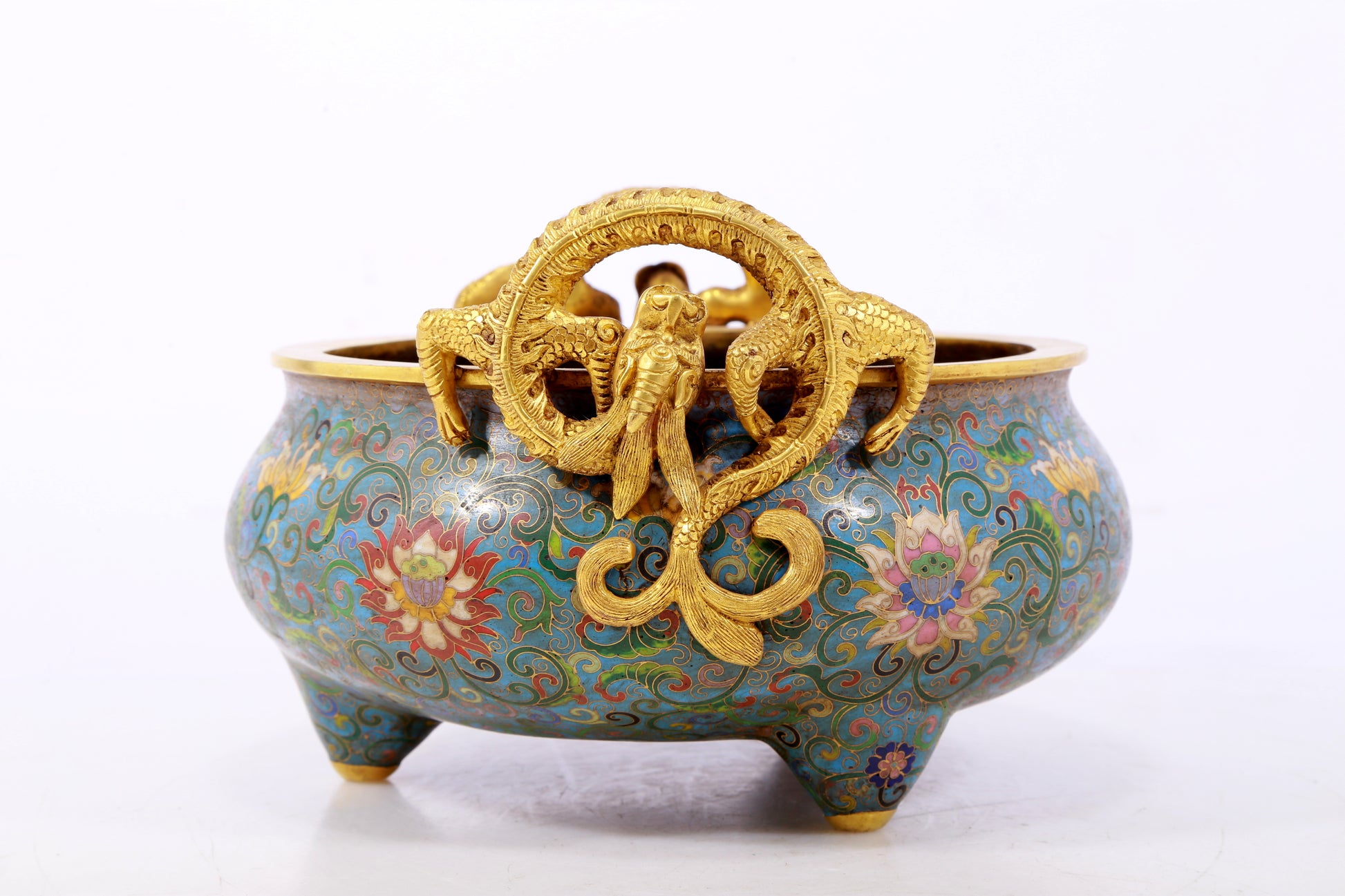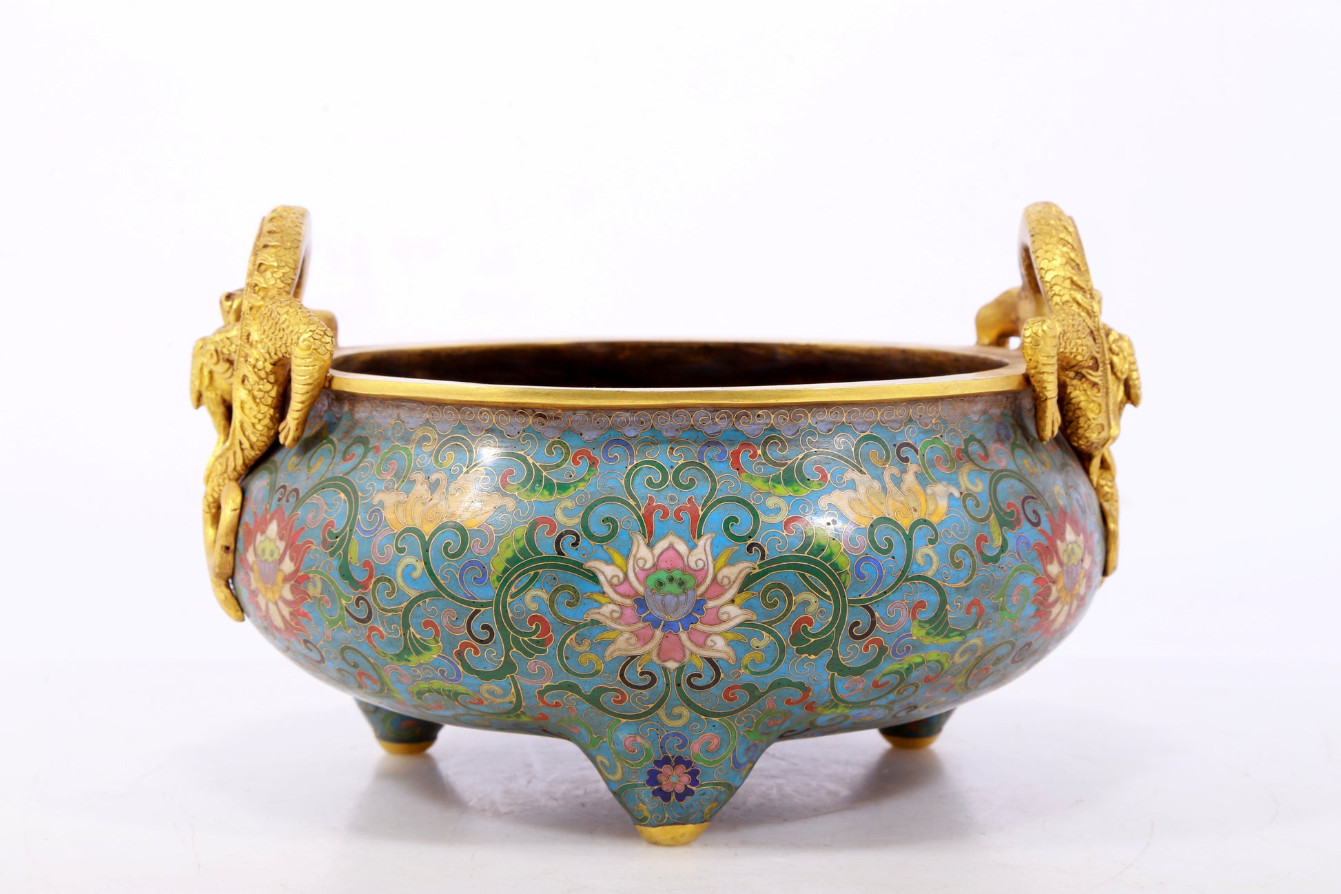 An exquisite cloisonné tripod censer with lotus pattern and dragon ears
