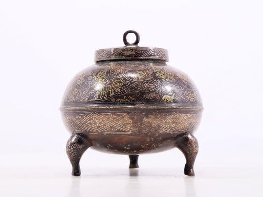 An Archaic Bronze Gold& Silver-Inlaid 'Auspicious Beast' Tripod Jar And Cover