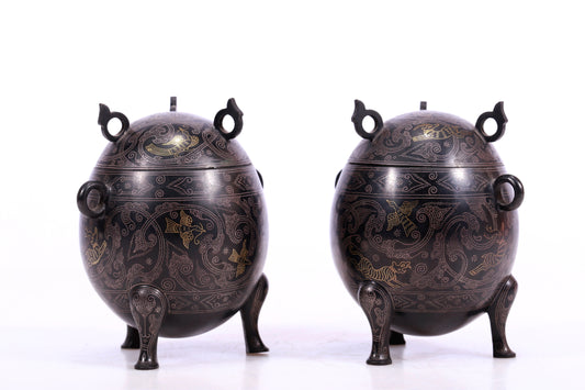 An Archaic Pair Of Bronze Gold& Silver-Inlaid 'Auspicious Beast' Tripod Censers And Covers