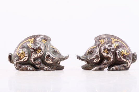An Archaic Pair Of Bronze Gold& Silver-Inlaid Auspicious Beast