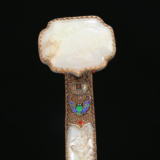 An Elaborate White Jade Gold-Mounted 'Bird& Flower' Ruyi Scepter