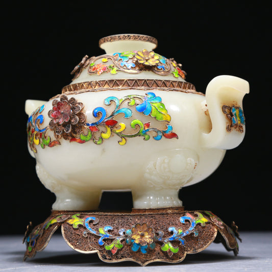 An Elaborate White Jade Gold-Mounted Blueing Tripod Jardiniere