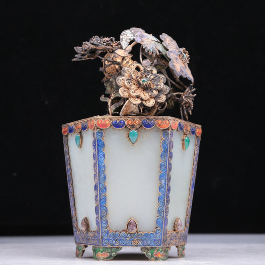 An Excellent White Jade Gilt-Silver-Mounted Blueing 'Jardiniere' Decoration
