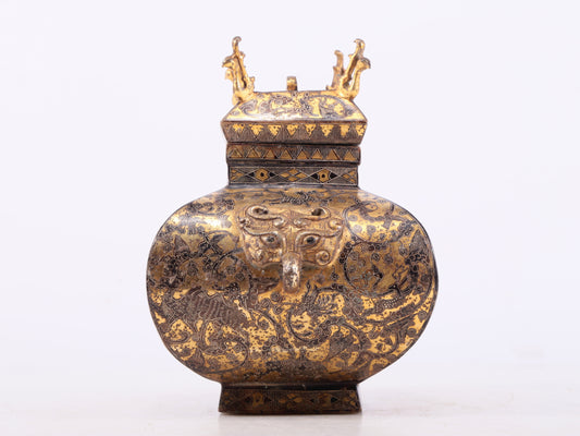 An exquisite bronze inlaid gold and silver auspicious animal pattern amphora with lid