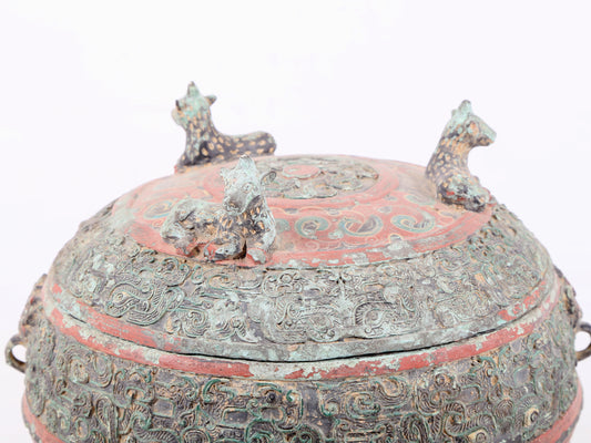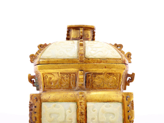 An exquisite bronze jar inlaid with white jade with auspicious animal patterns