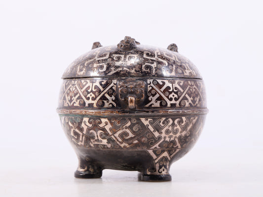 An exquisite bronze-inlaid silver animal-eared tripod jar with lid